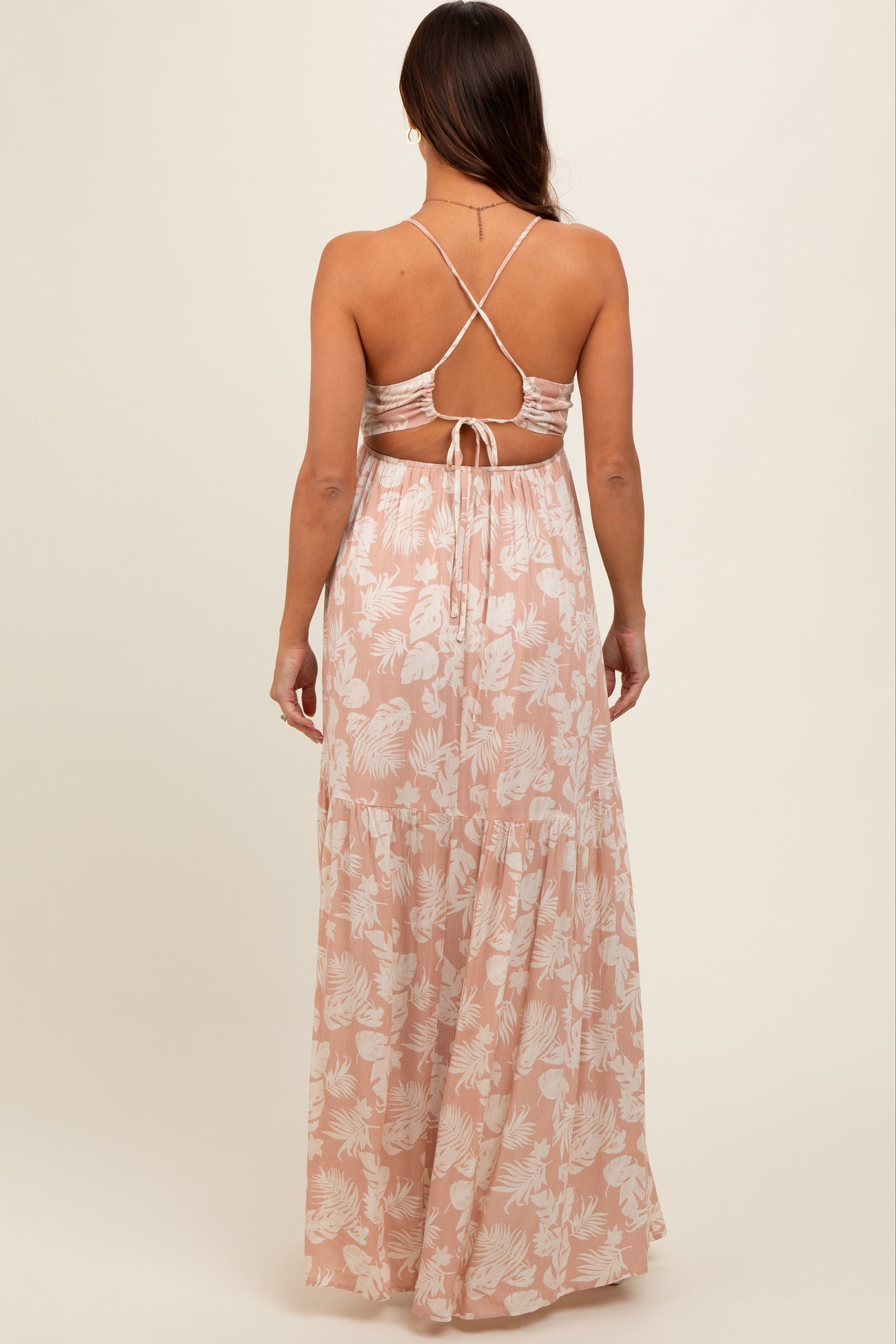 Light Pink Foral Front Cutout Open Cross Back Maternity Maxi Dress