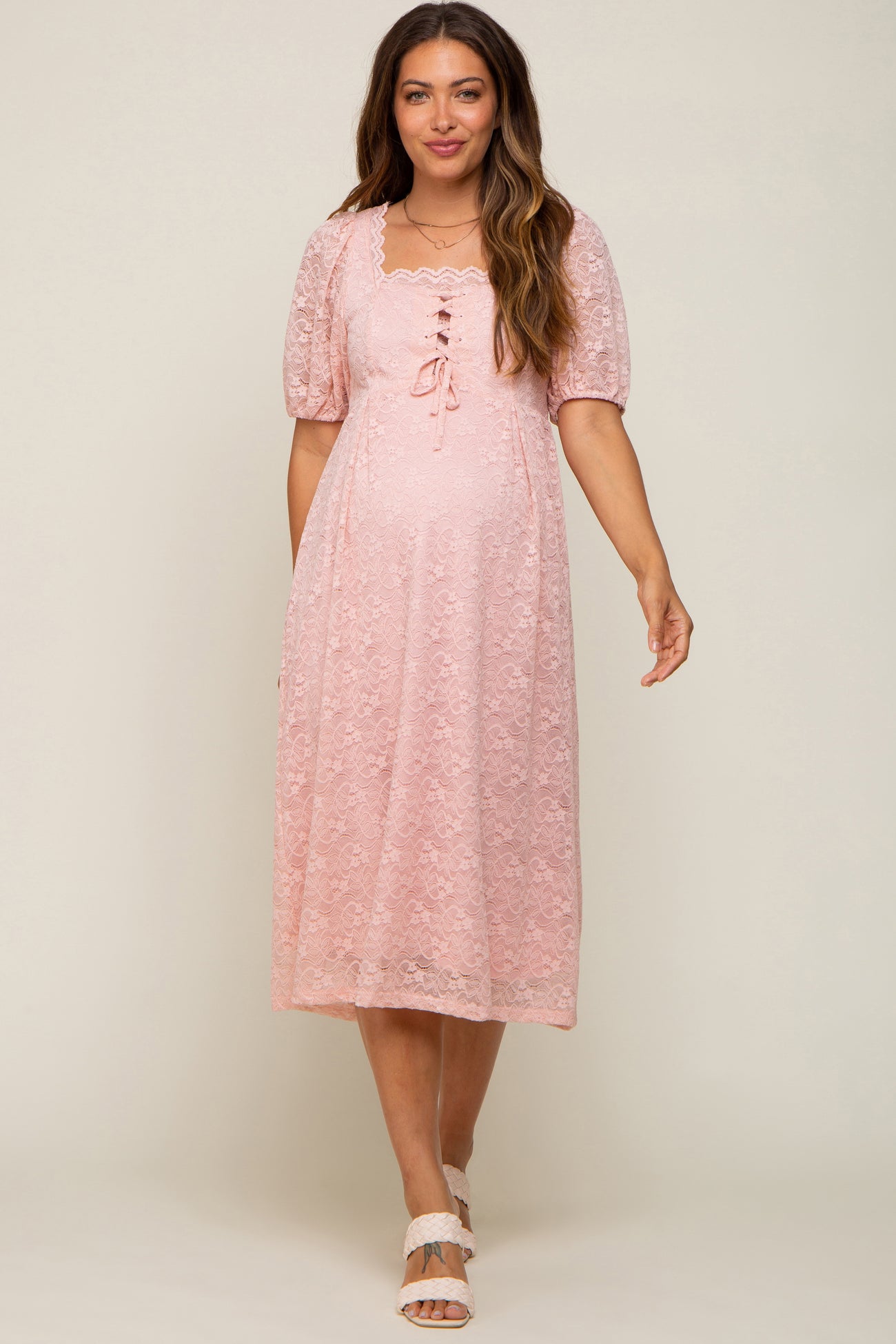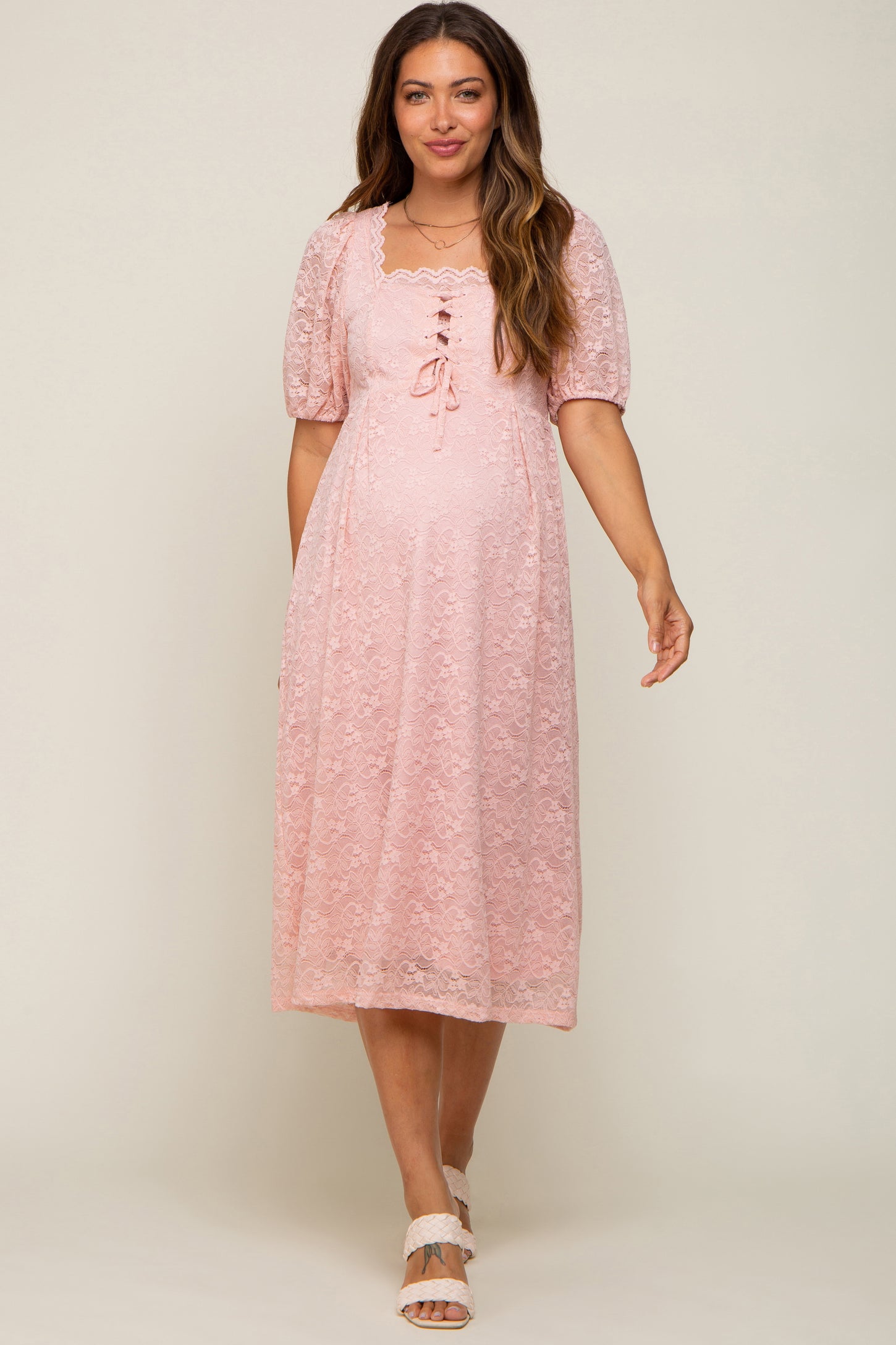 A solid lace maternity midi dress with puff sleeves, lace up detail on bust, back zipper closure and cutout back detail with tie. Dress is double lined.