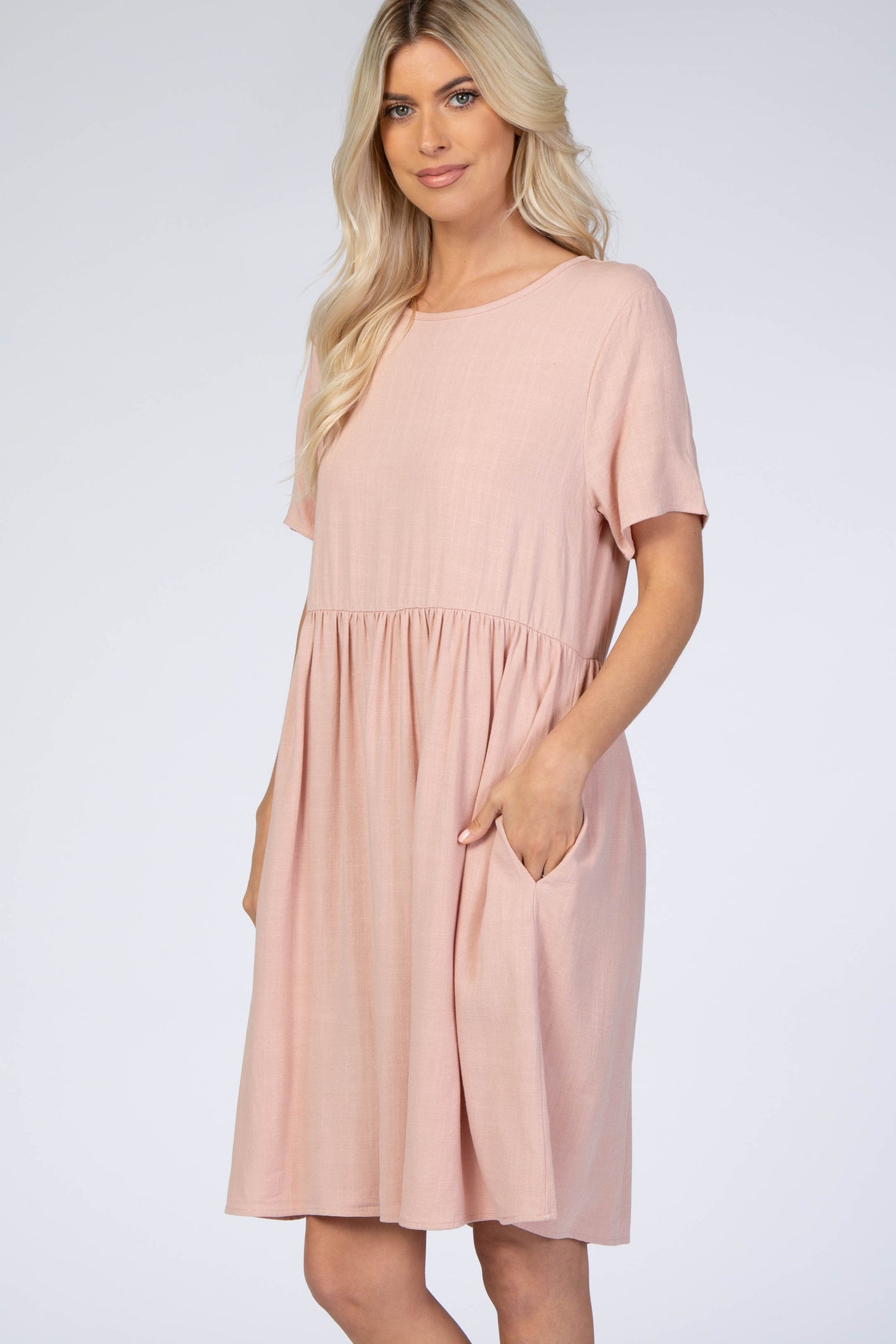 A linen dress featuring a rounded neckline, short sleeves, a babydoll hem and side pockets.
