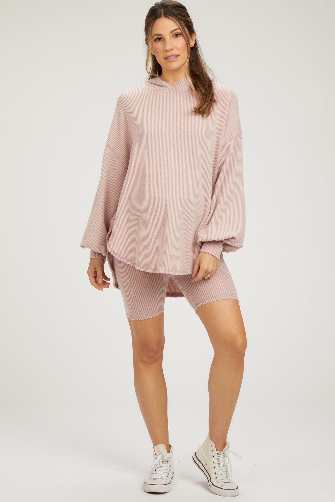 Light Pink Ribbed Hoodie Bike Shorts Maternity Set