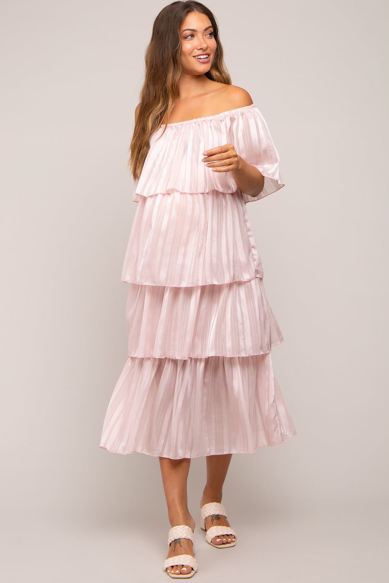 A striped maternity midi dress featuring an off the shoulder neckline, a flounce top, and a layered body.