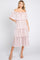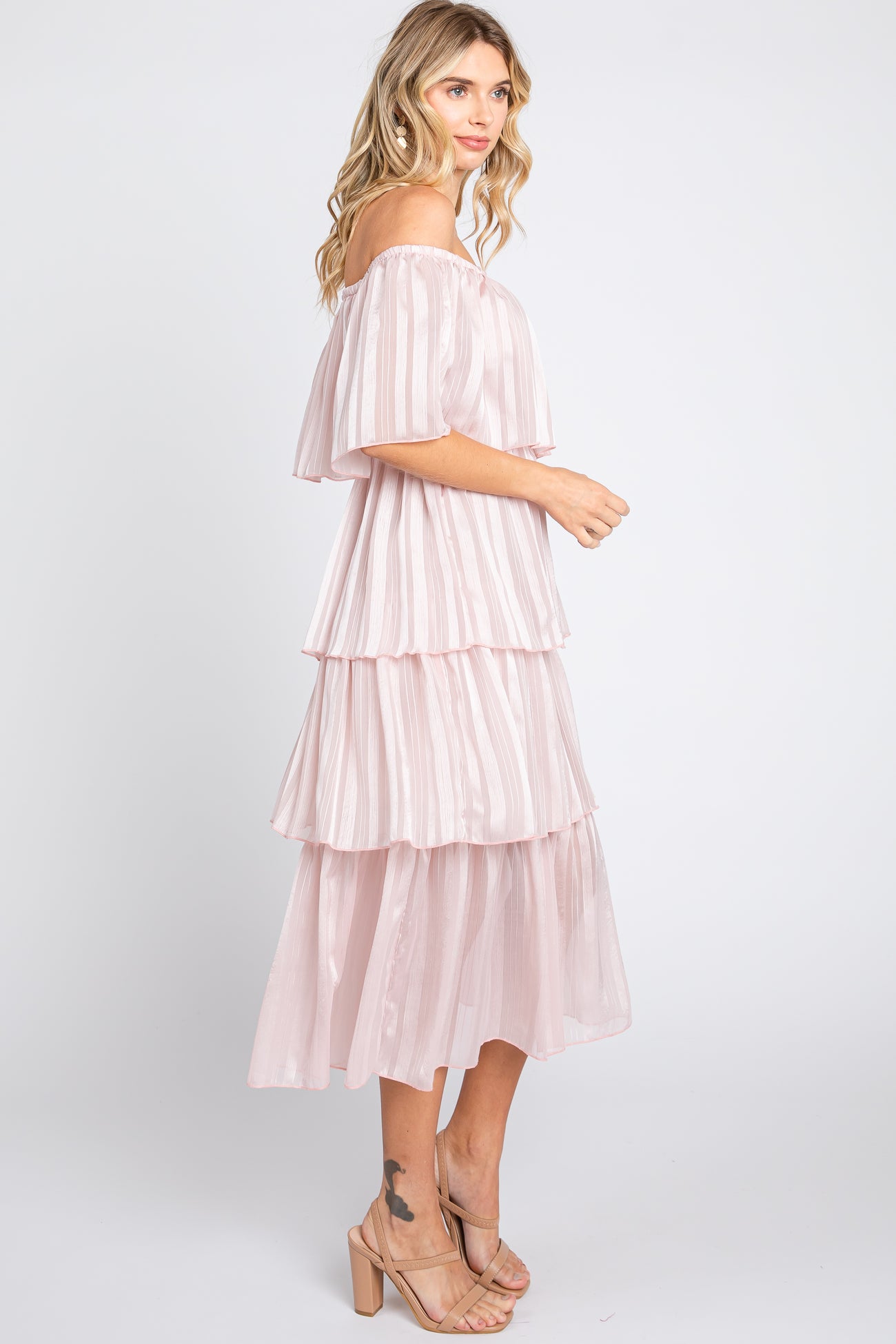 A striped midi dress featuring an off the shoulder neckline, a flounce top, and a layered body.