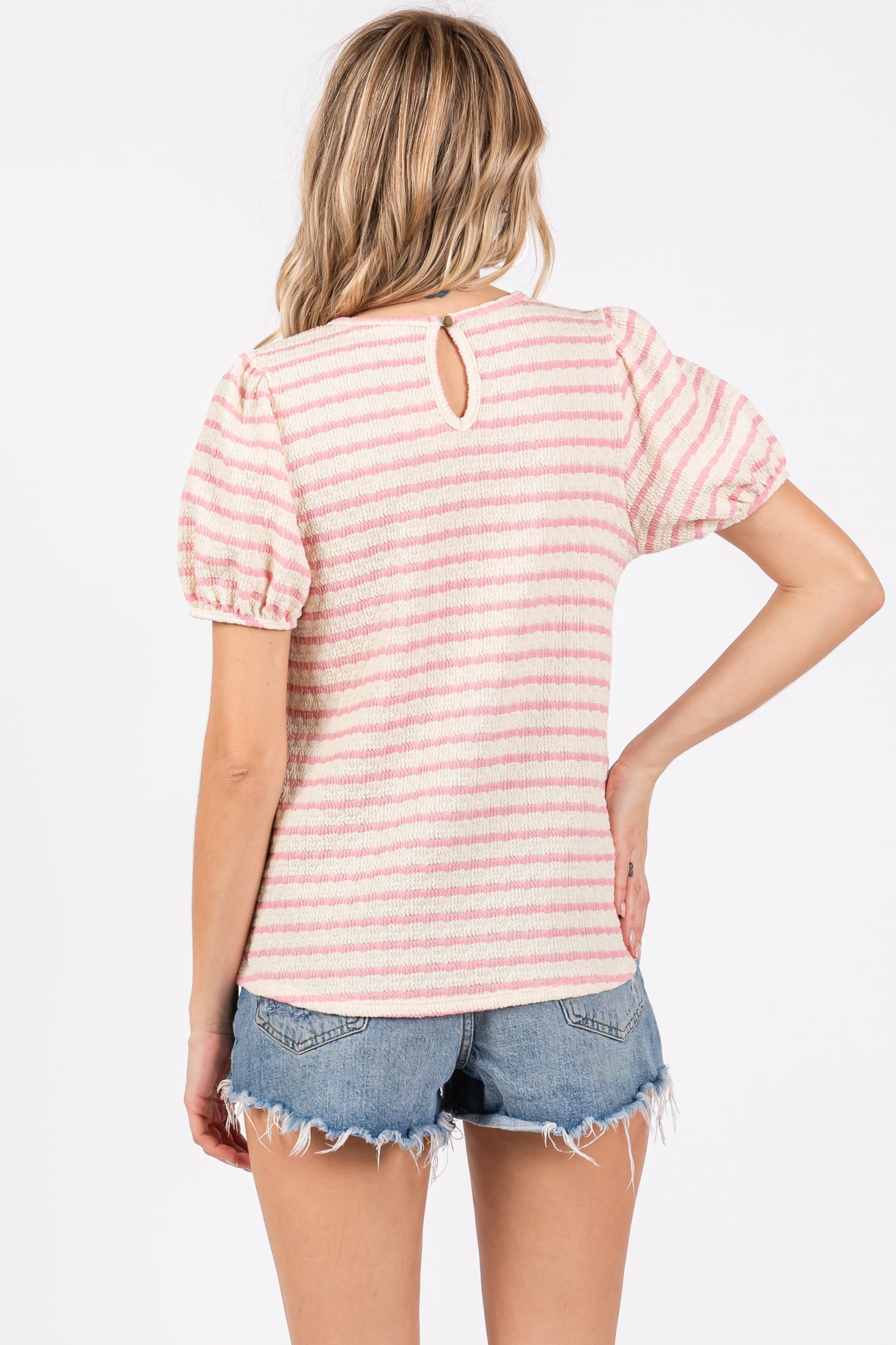 A textured striped top featuring short puff sleeves, a rounded neckline and back keyhole cutout button closure.