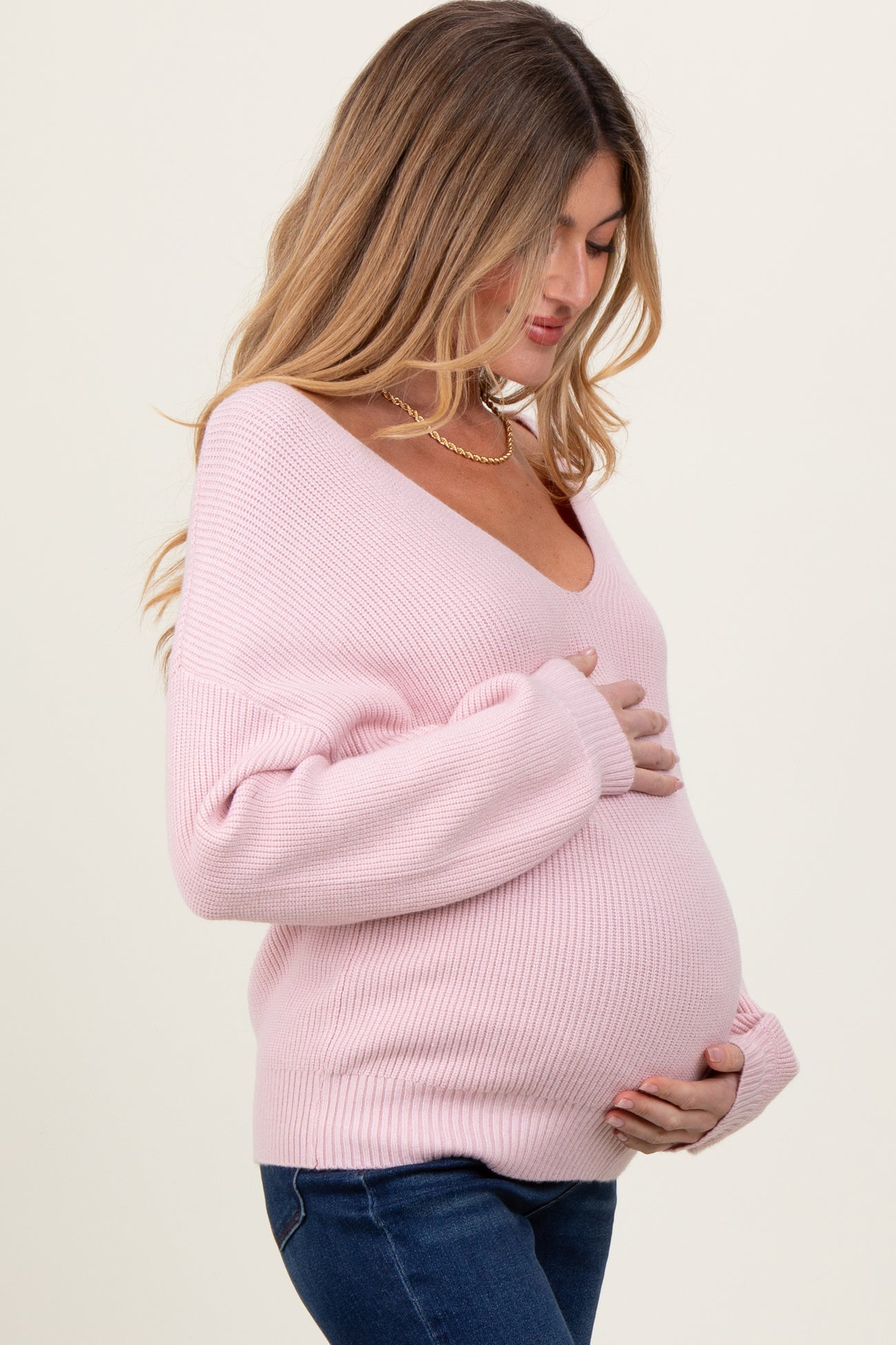 Light Pink V-Neck Drop Shoulder Back Bow Tie Maternity Sweater