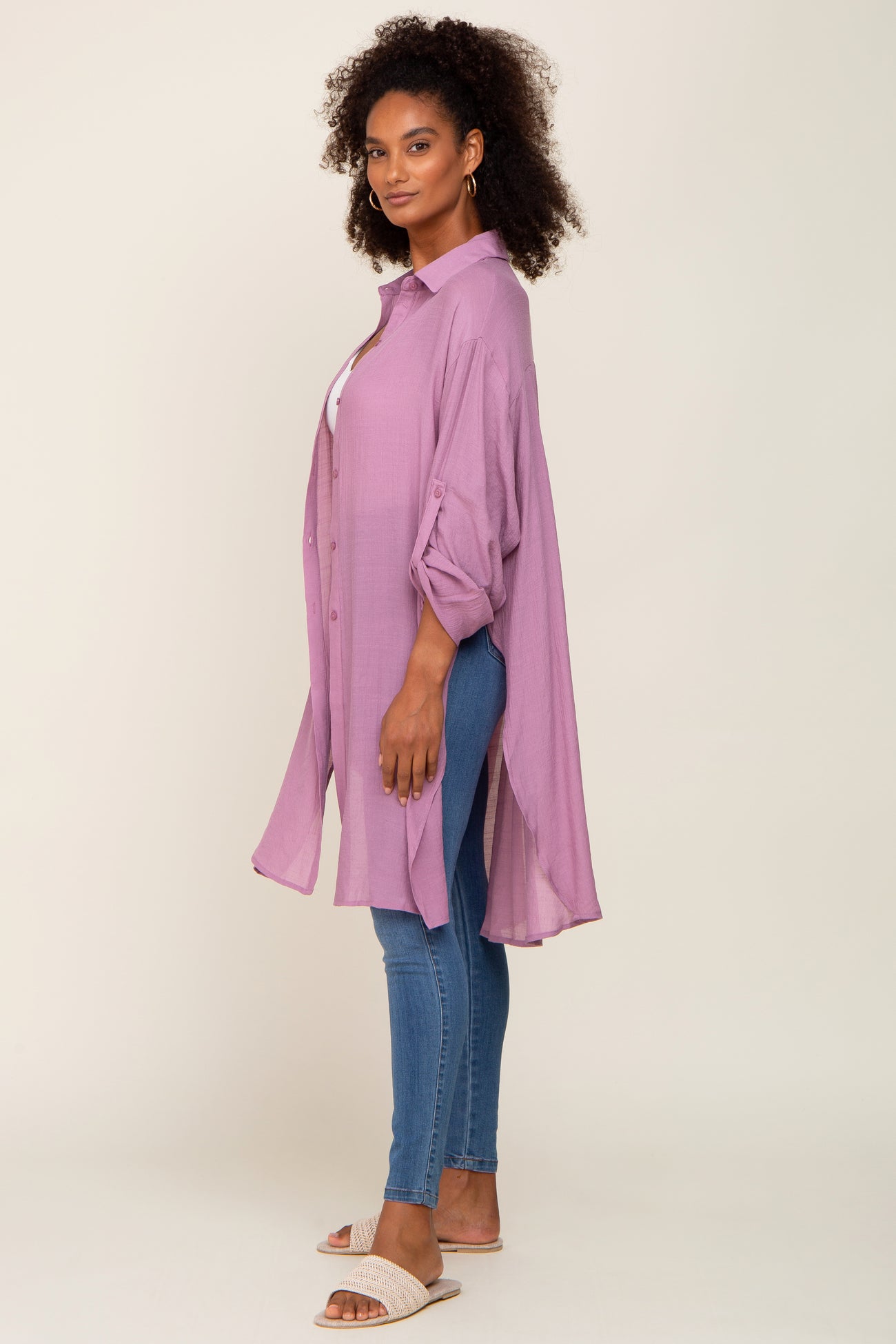A solid top featuring a collared neckline, a button down front, an oversized fit, side slits and long sleeves.