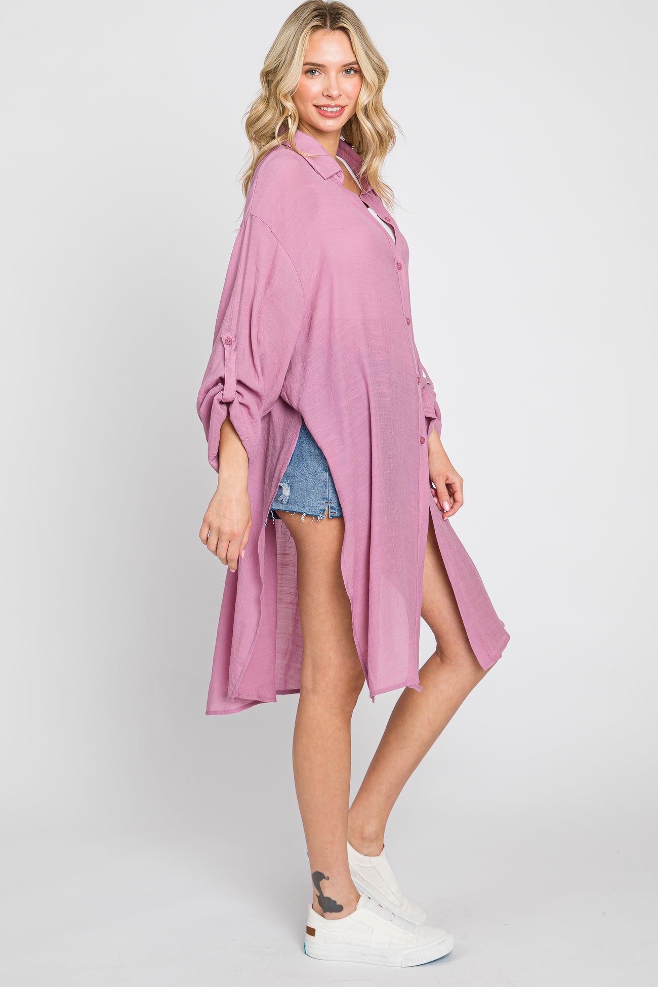 Mauve Button Front Side Slit Oversized Blouse
