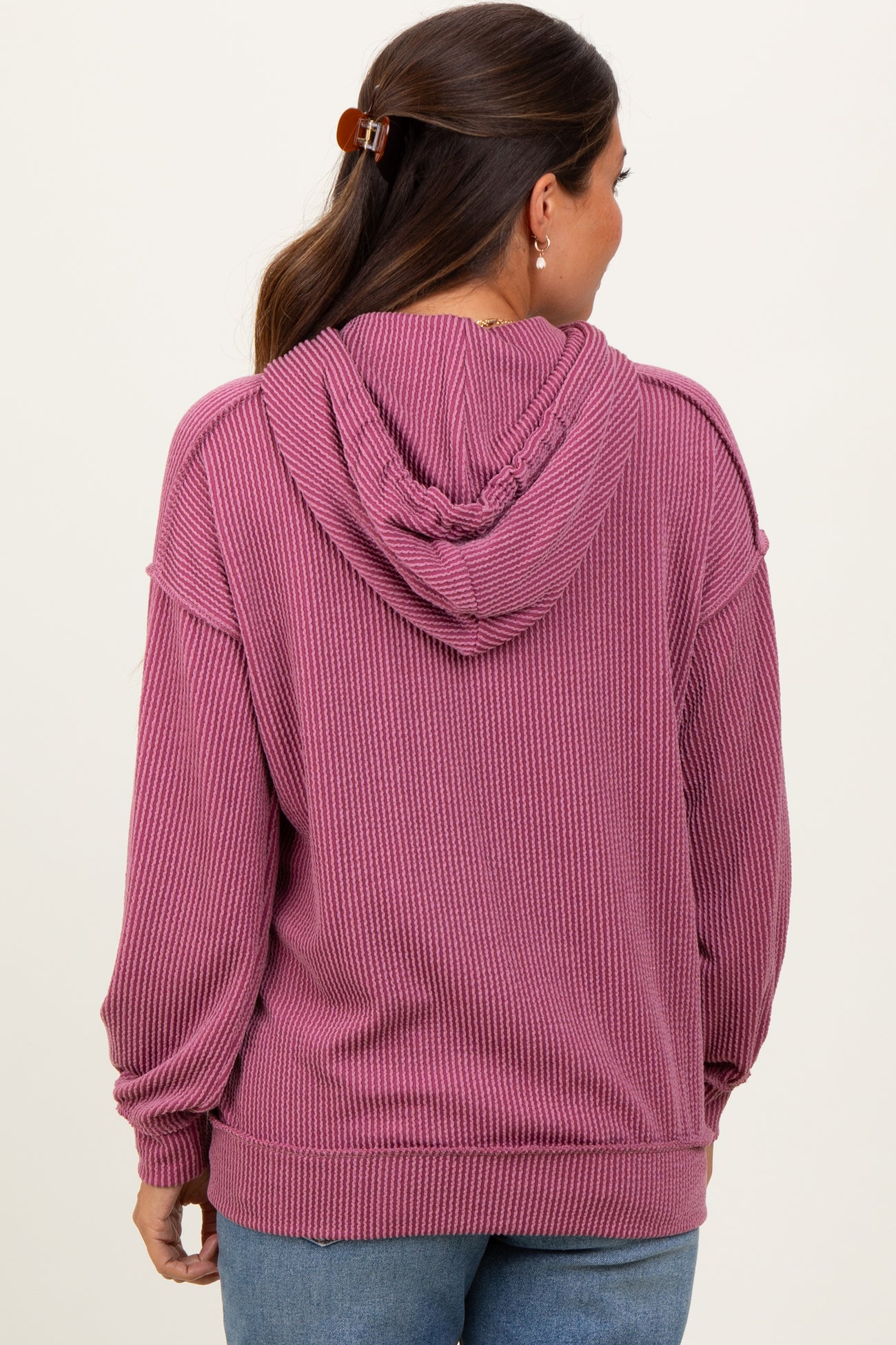 Stay cozy and stylish throughout your pregnancy with our Mauve Ribbed Front Pocket Maternity Drawstring Hoodie. Made from soft, textured ribbed fabric, this hoodie offers gentle stretch and comfort for your growing belly. The relaxed fit features a drawstring hood for adjustable coverage and practical front pockets for added convenience. Its rich mauve color adds a trendy pop to your maternity wardrobe, perfect for casual outings or relaxing at home. Lightweight yet warm, this hoodie is an essential layering piece that adapts with you from bump to baby. Embrace comfort and effortless style with this maternity must-have!