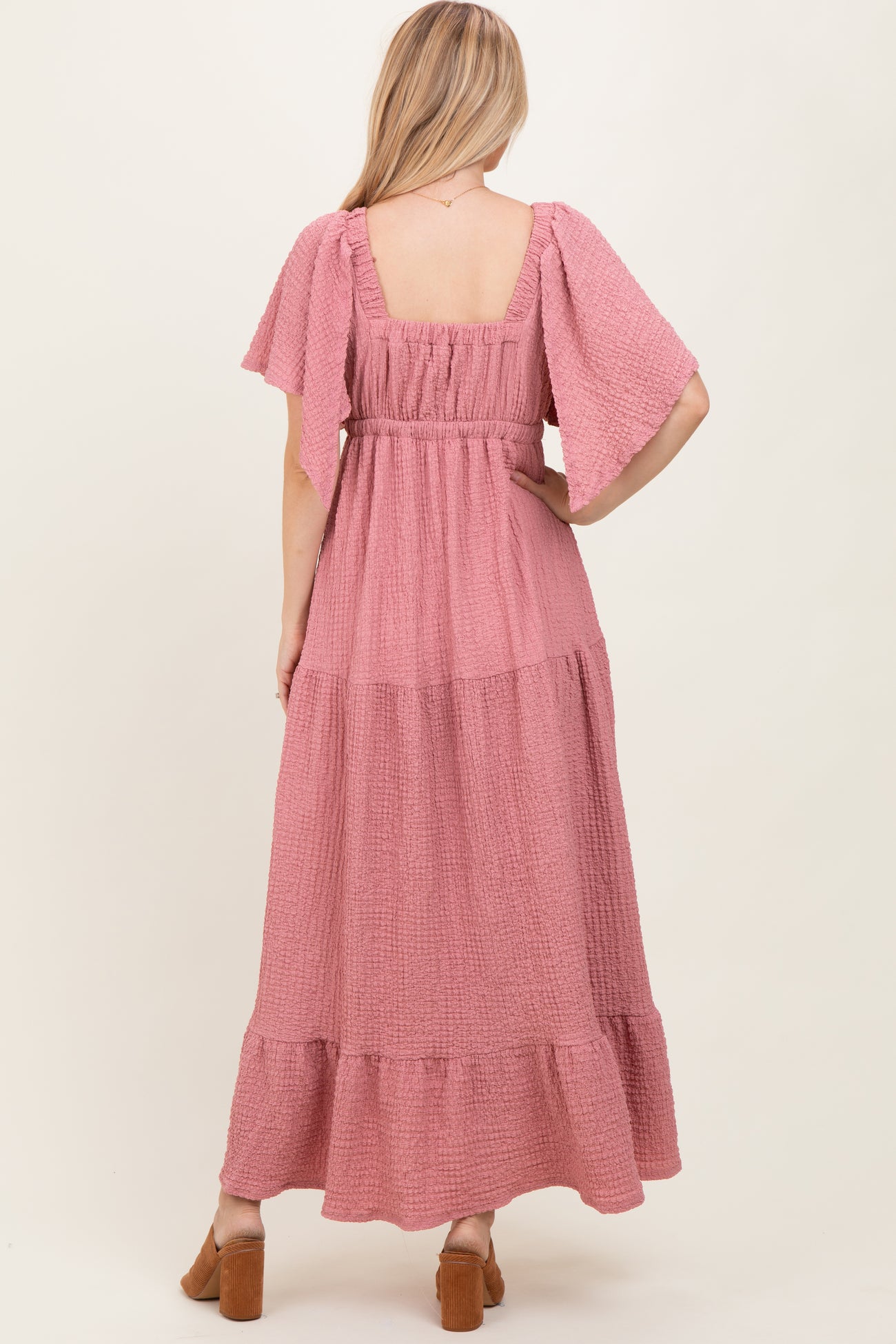 Mauve Textured Flutter Sleeve V-Neck Tiered Maxi Dress