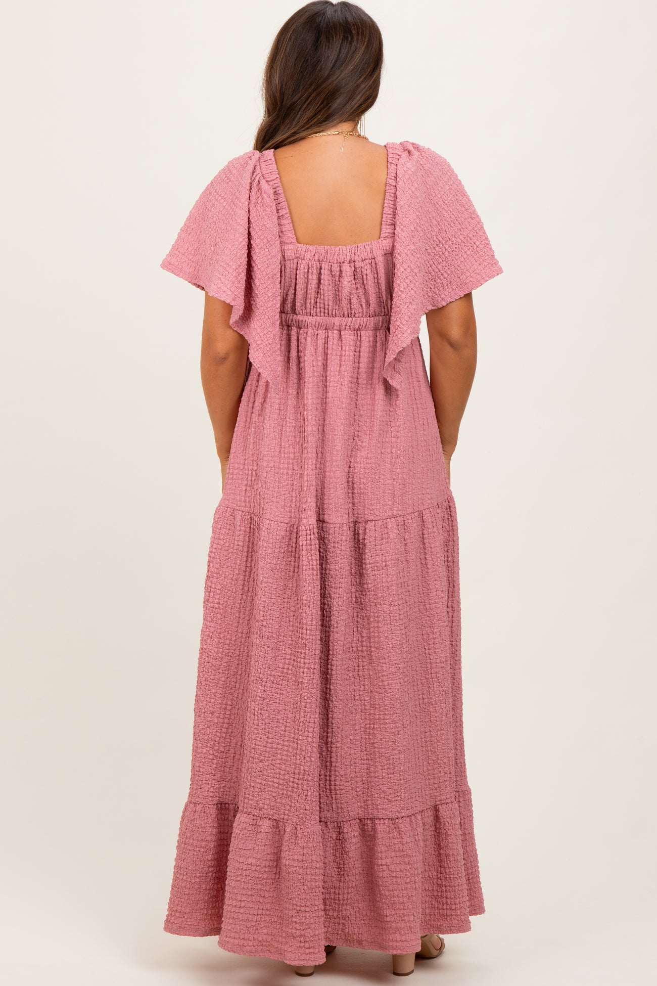 Mauve Woven Textured Flutter Sleeve V-Neck Tiered Maternity Maxi Dress
