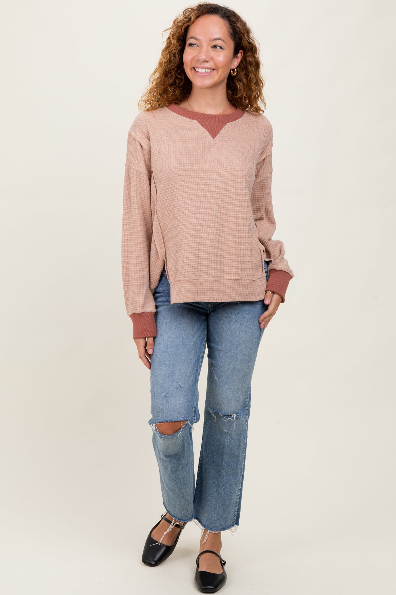 Stay cozy and stylish in our Mocha Oversized Contrast Trim Thermal Pullover. Featuring a relaxed fit and soft waffle-knit fabric, this pullover is perfect for layering on cooler days. The mocha color is beautifully complemented by contrasting rust-colored trim at the neckline, cuffs, and hem, adding a modern twist to a classic design. Side slits offer ease of movement and a flattering silhouette. Pair it with your favorite jeans or leggings for effortless everyday comfort with a chic edge. Ideal for casual outings or cozy weekends at home—this versatile piece is a must-have for your fall and winter wardrobe.