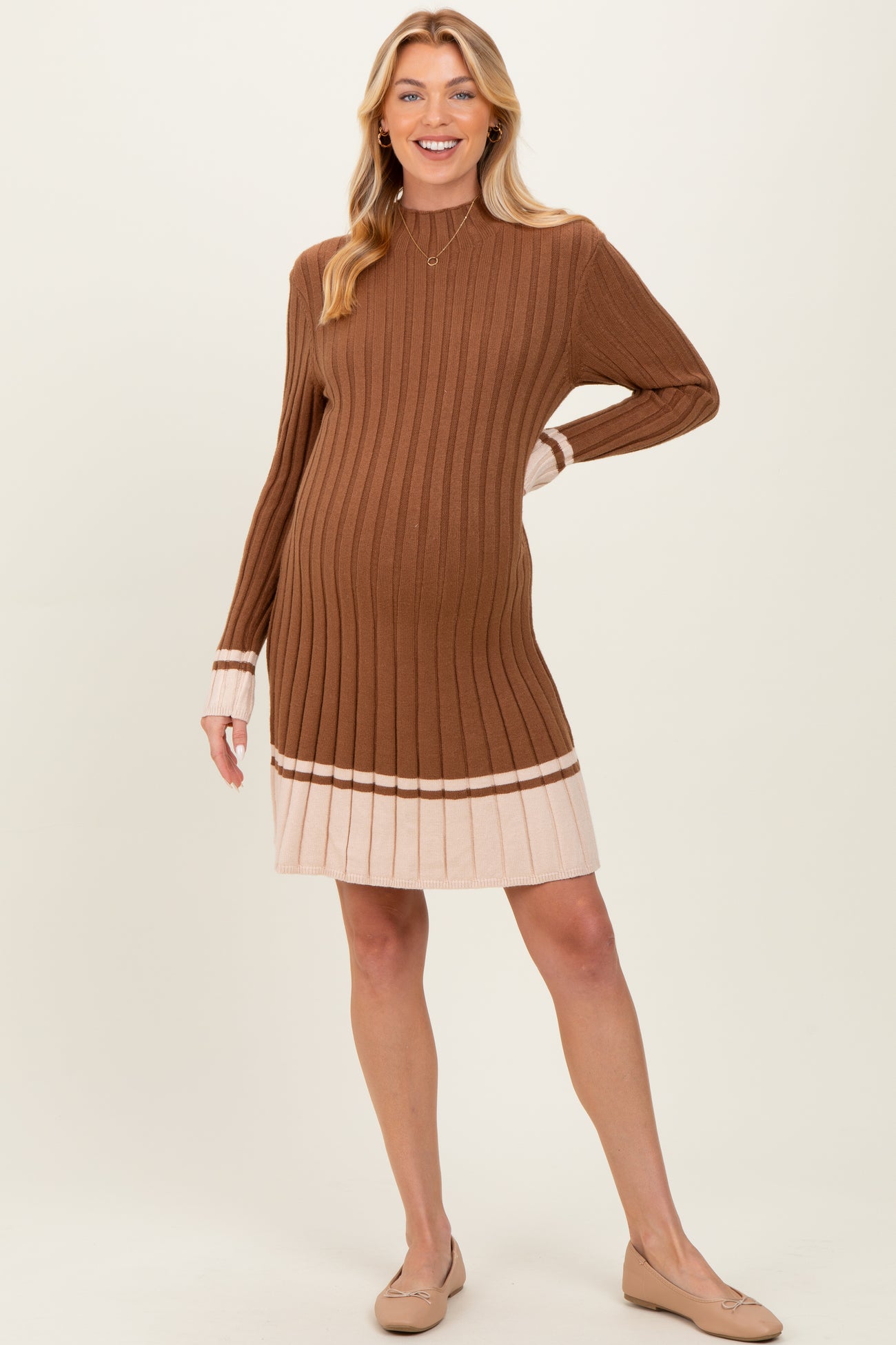 Mocha Ribbed Contrast Hem Maternity Sweater Dress