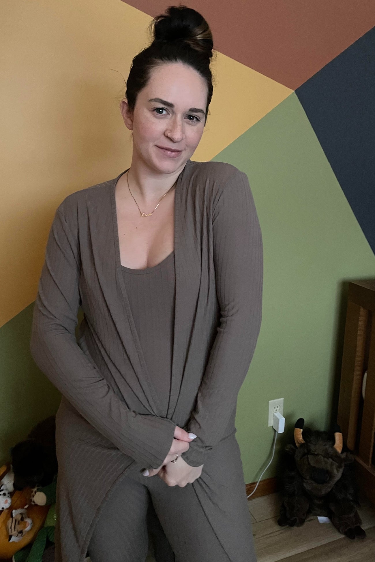 A ribbed knit jumpsuit set featuring a sleeveless fitted bodycon jumpsuit and a long sleeve cardigan.