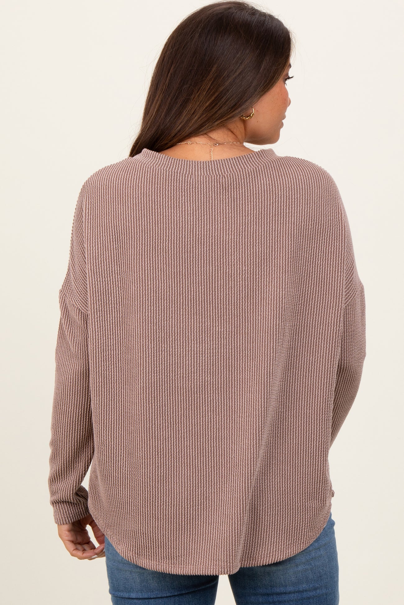 Stay cozy and stylish throughout your pregnancy with our Mocha Ribbed Knit Relaxed Fit Round Hem Maternity Top. Crafted from soft, breathable fabric, this top features a flattering ribbed texture and a relaxed fit that comfortably accommodates your growing bump. The round hem adds a modern touch and extra coverage, while the long sleeves make it perfect for cooler days. Pair it effortlessly with your favorite maternity jeans or leggings for a casual yet chic look. Ideal for lounging at home or running errands, this versatile top is a must-have for every mom-to-be’s wardrobe.