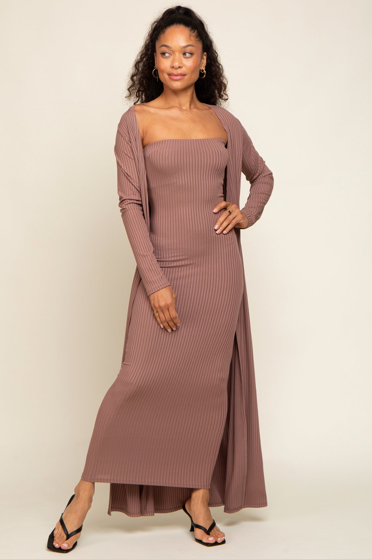 Mocha Ribbed Sleeveless Dress Cardigan Maternity Set