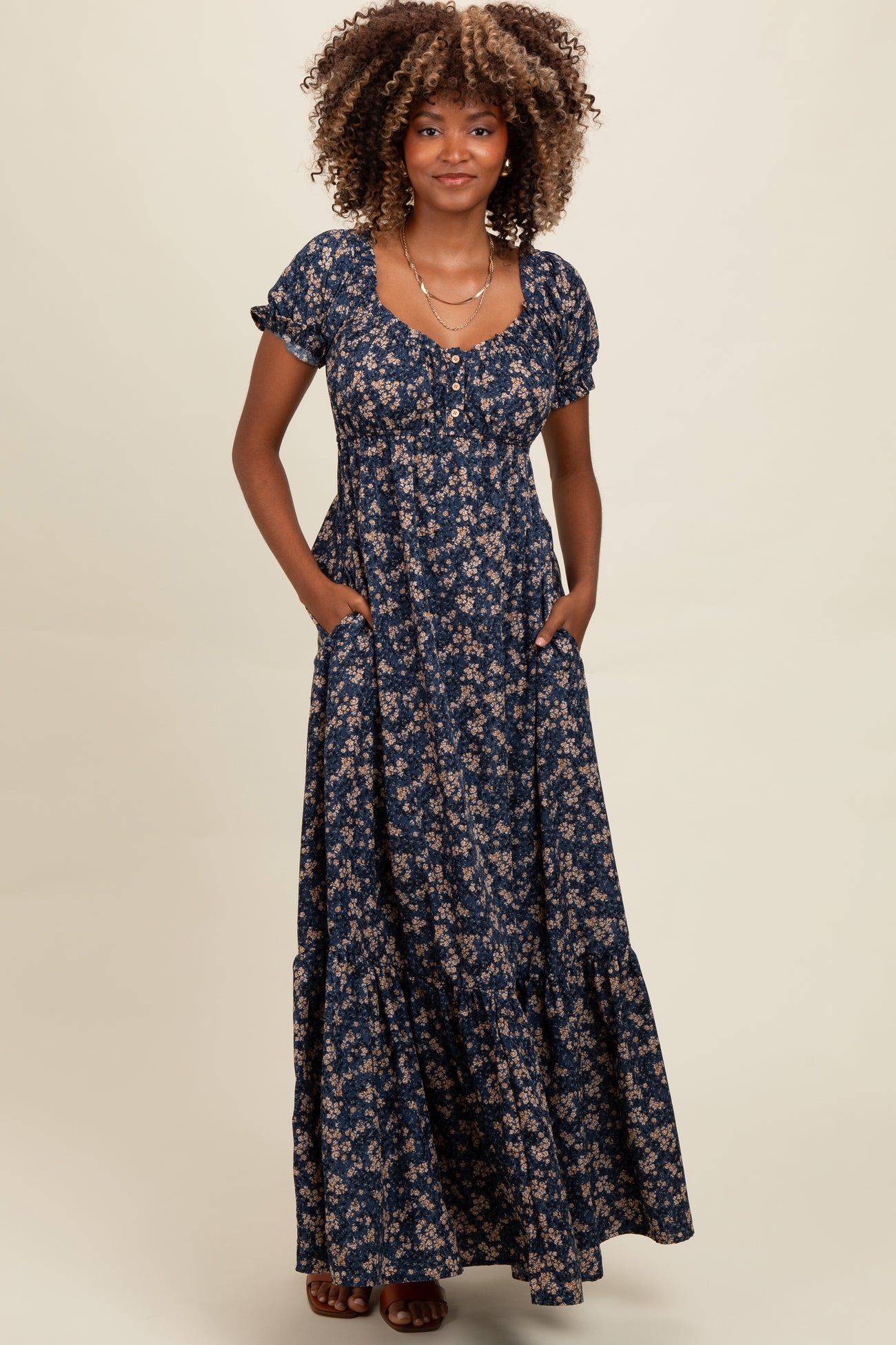 Navy Blue Floral Button Accent Maternity Maxi Dress