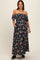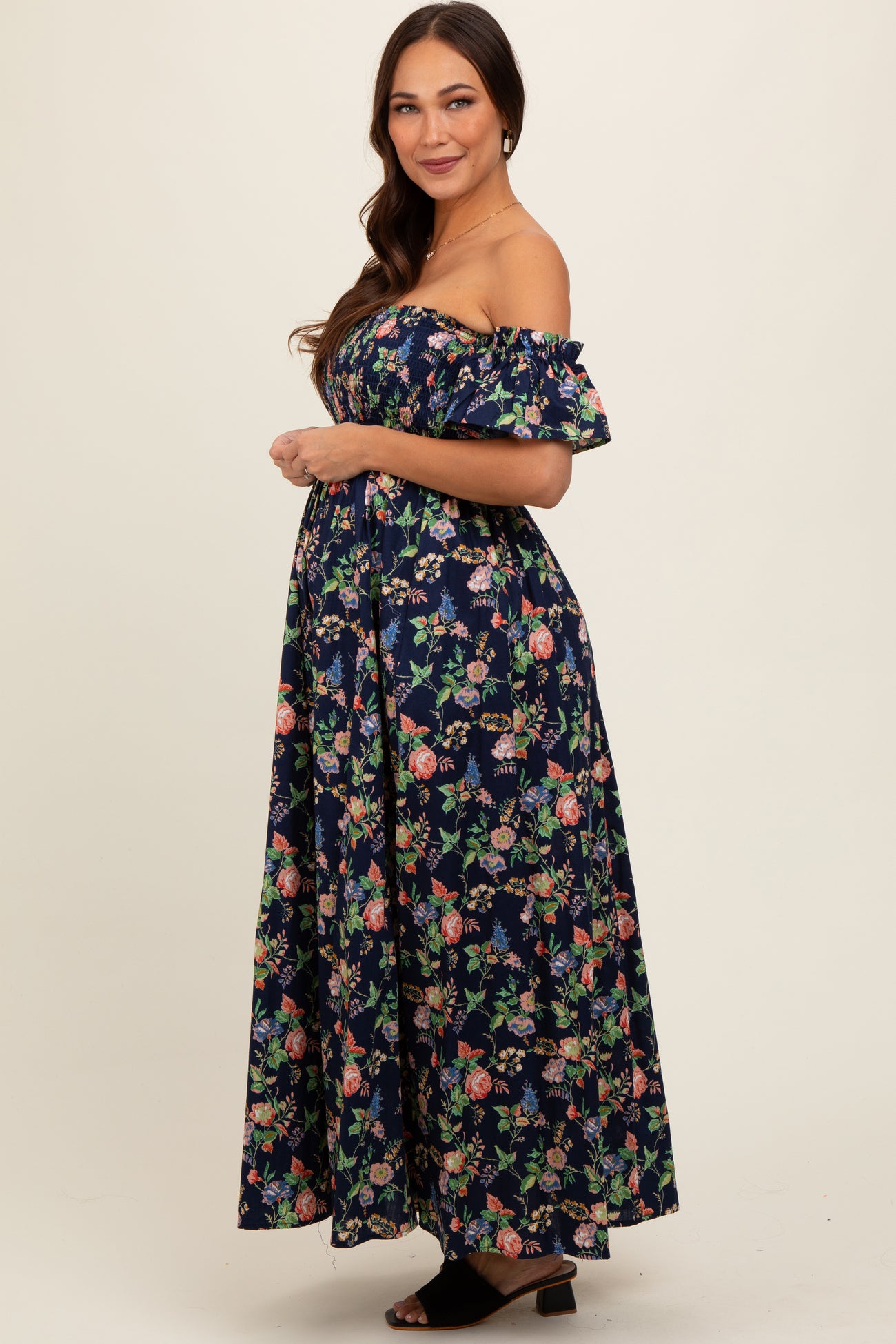 Floral off the shoulder maternity dress with a smocked bodice, side pockets, and ruffle sleeves.