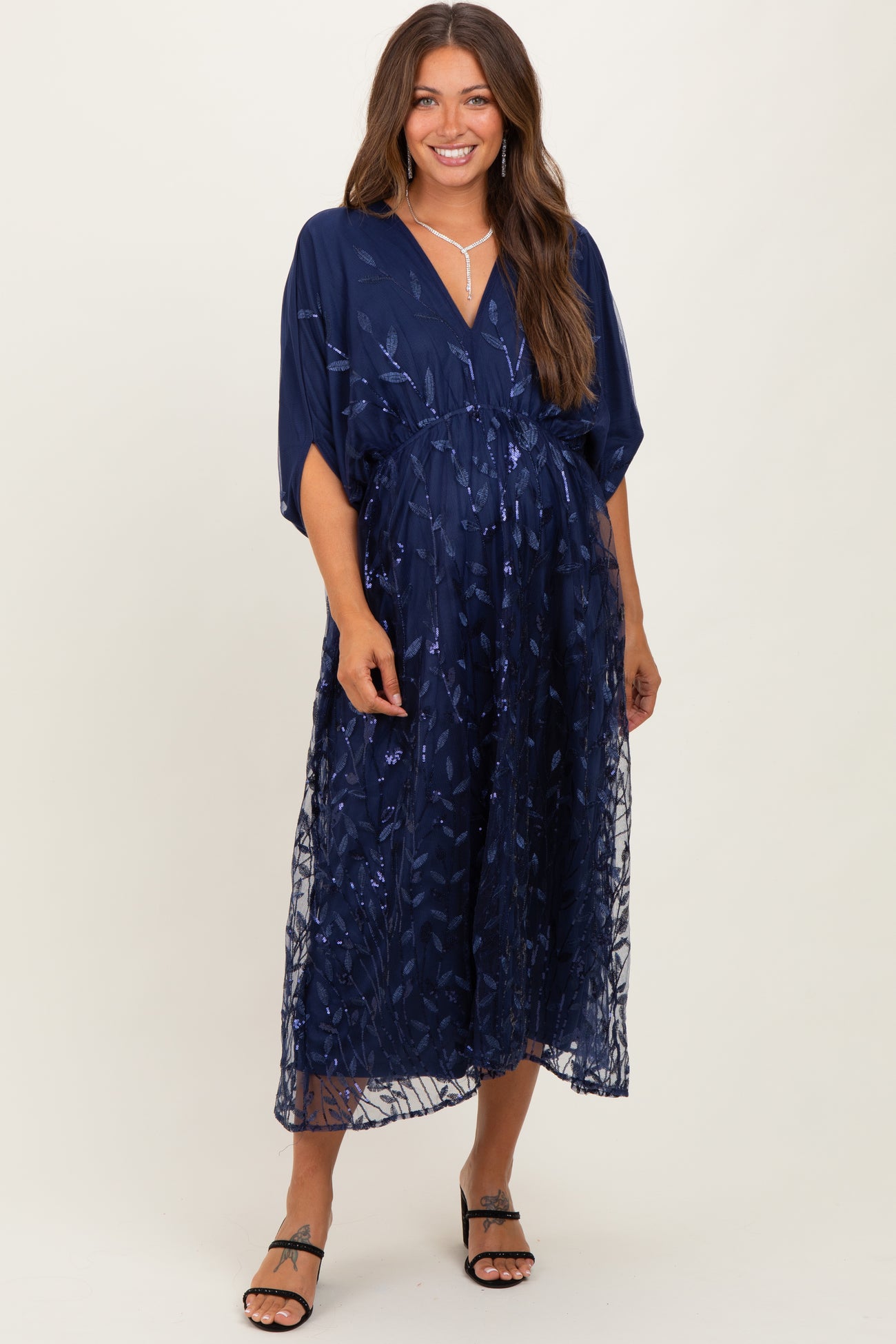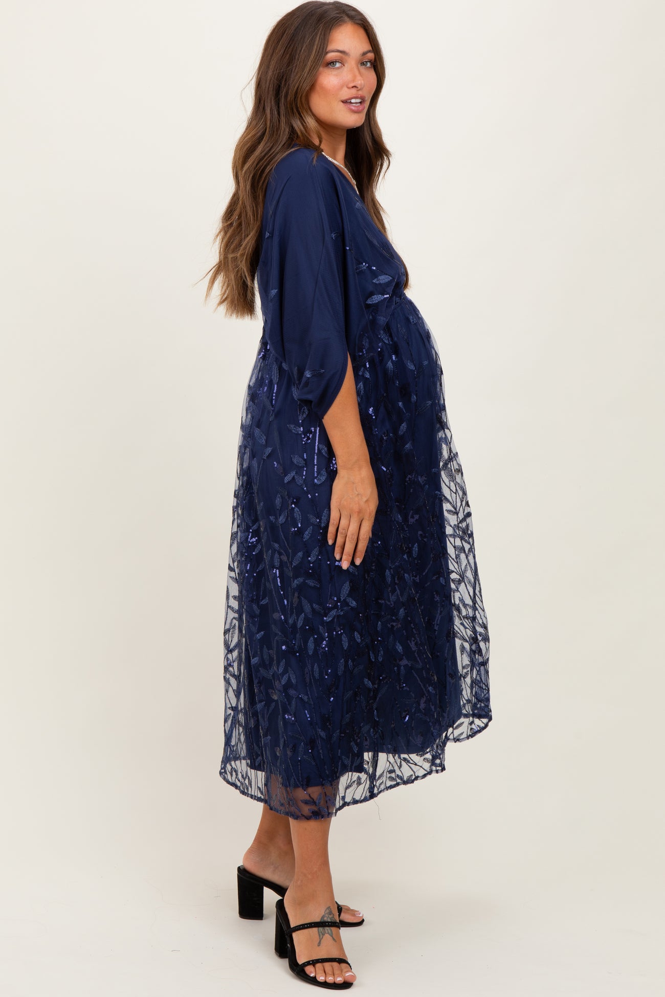 Navy Embroidered Tulle Dolman V-Neck Maternity Midi Dress
