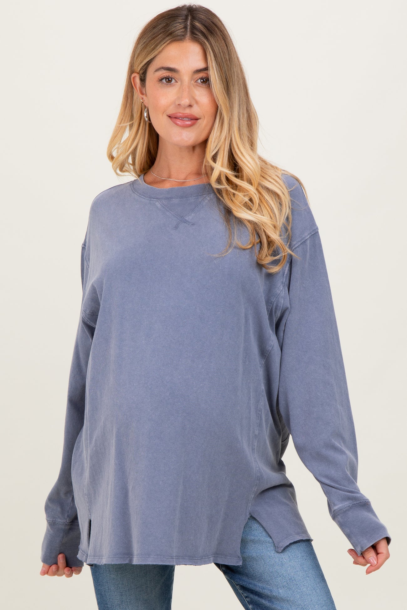 Navy Mineral Washed Drop Shoulder Long Sleeve Maternity Top