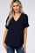 A solid hued maternity blouse featuring short sleeves and a v-neckline.