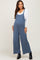 A solid sleeveless maternity jumpsuit featuring wide legs, a front pocket and side pockets.