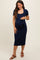 A solid hued maternity midi dress featuring short sleeves, a belted waist and a square neckline.