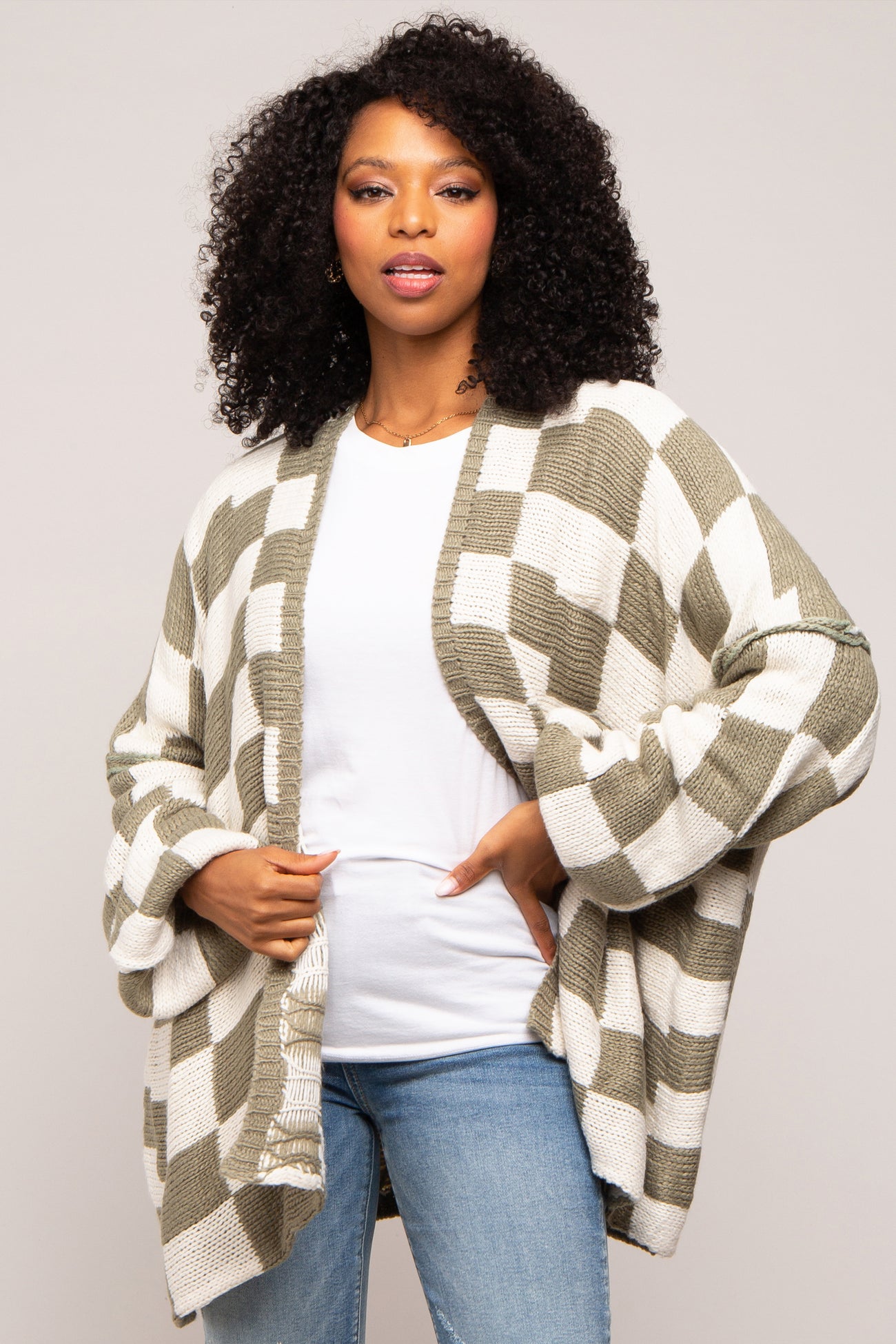 Olive Checkered Print Oversized Cardigan