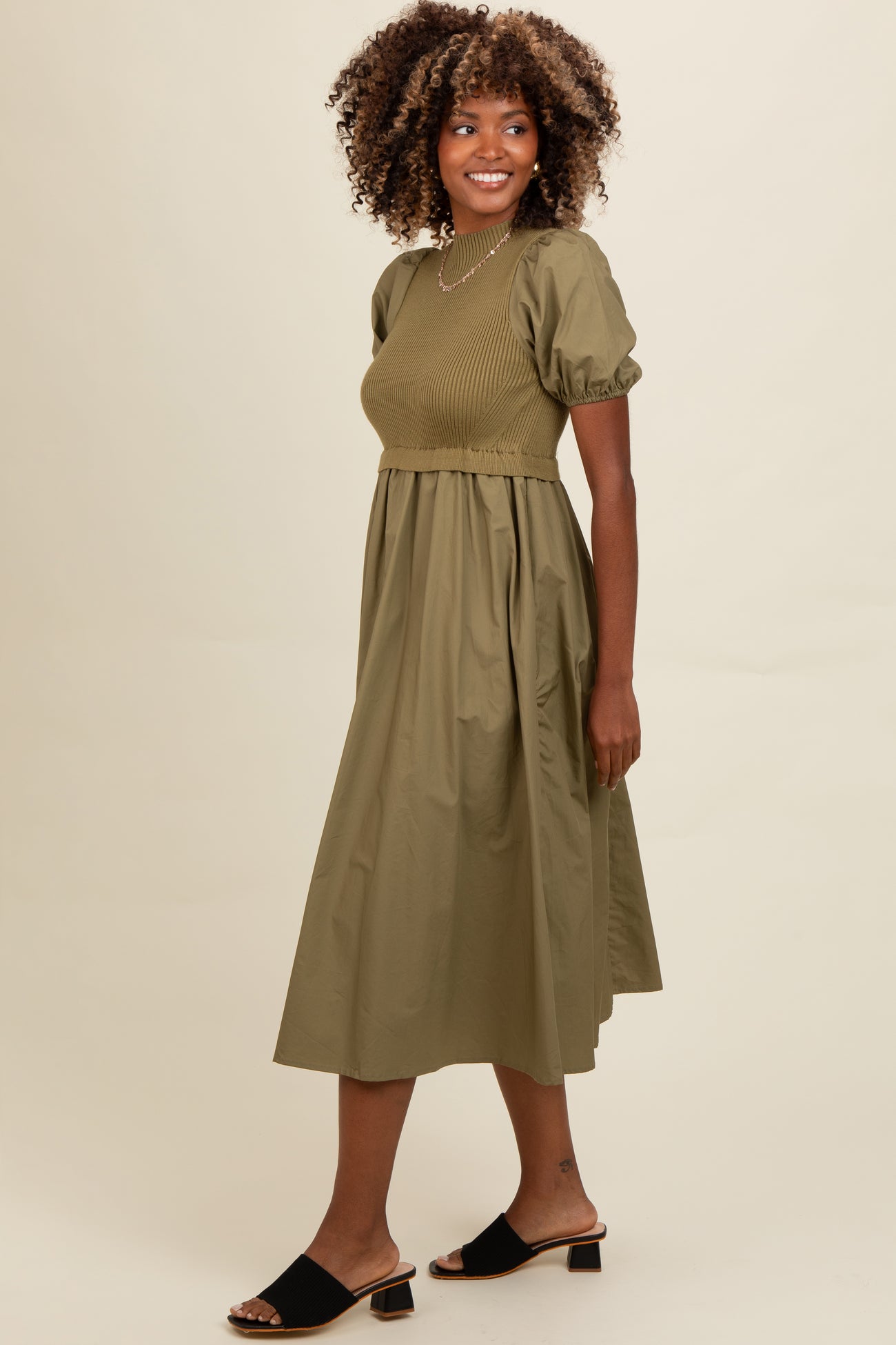 Elevate your style with our Olive Contrast Knit Bodice Midi Dress, featuring a chic combination of knit and woven fabrics. The fitted, ribbed knit bodice offers a flattering silhouette with a high neckline and puffed short sleeves that add a touch of vintage charm. The midi-length skirt flows gracefully from the waist, crafted from lightweight, breathable fabric for all-day comfort. Perfect for both casual outings and special occasions, this dress pairs effortlessly with sandals or heels. Make a statement in timeless olive green—versatile, stylish, and designed to turn heads wherever you go. Available in multiple sizes.