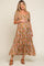 A floral printed maternity maxi dress featuring a square neckline, short puff sleeves, a smocked elastic top, side pockets and a tiered skirt.