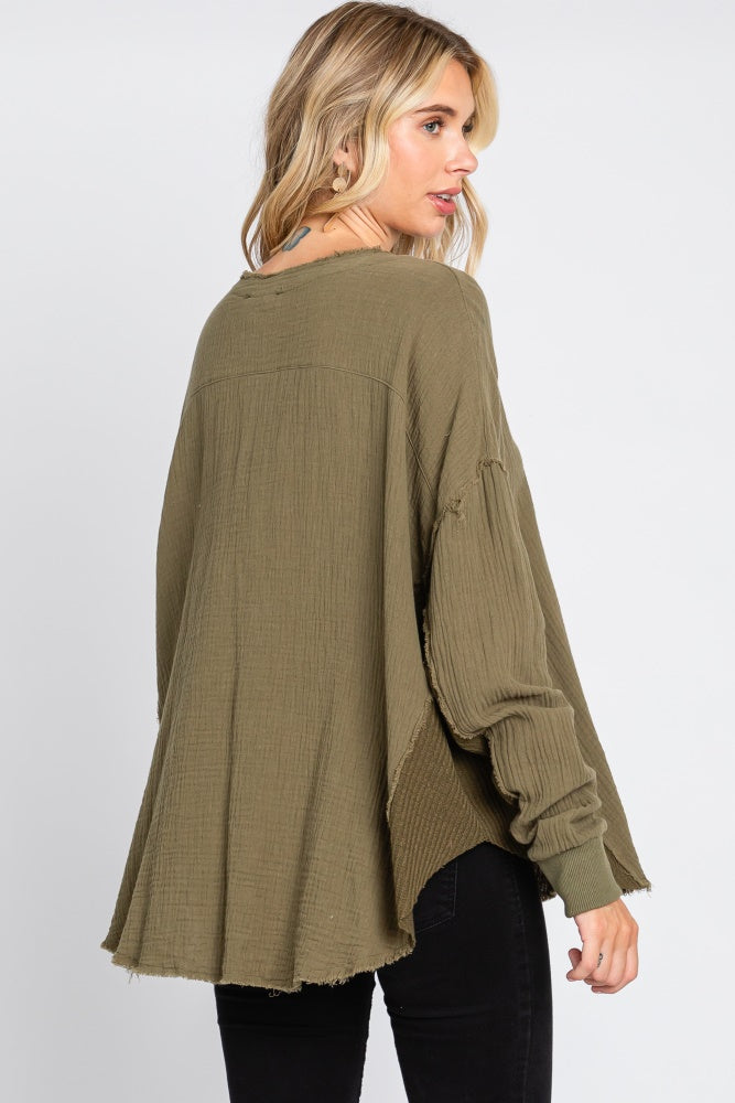 A lightweight top with front functioning buttons, a rounded raw neckline, a front pocket, long drop shoulder sleeves, and a curved raw hem. Waffle knit contrast on the front button plague and along the sides.