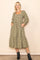 A gingham midi dress featuring a squared neckline, ruffle accents along the shoulders, long puff sleeves, a smocked top, side pockets, and a gathered bottom hem.