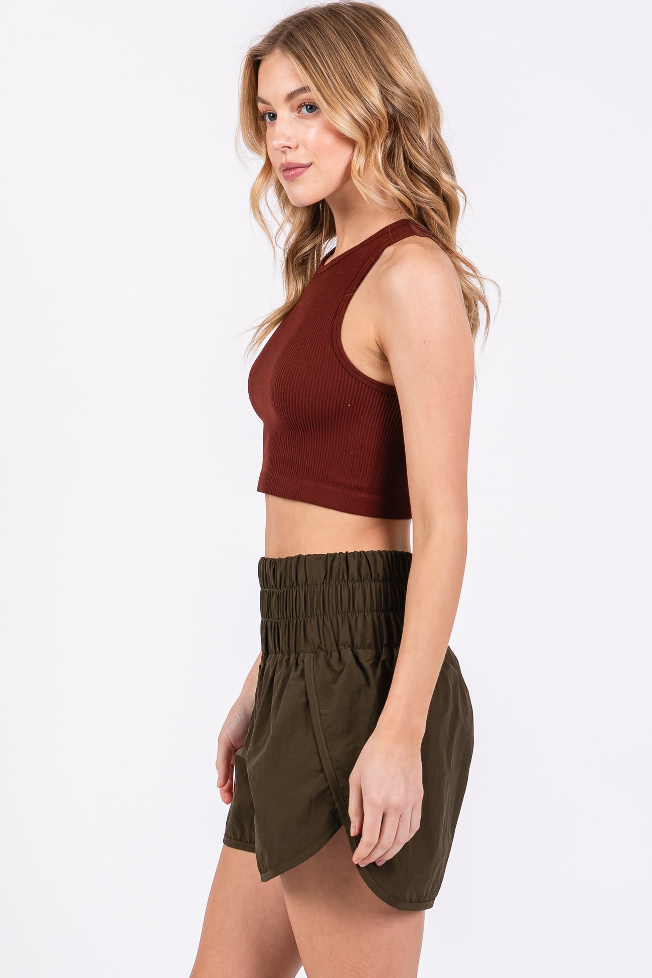 Details A pair of solid active shorts featuring a curved slit hem and an elastic waistband. Content + Care
