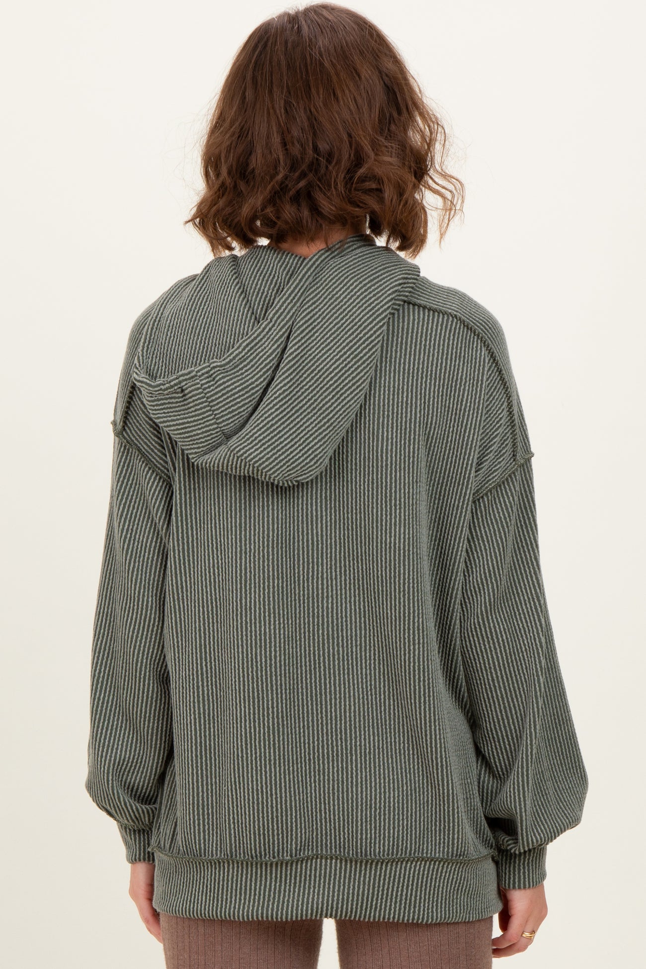 Olive Ribbed Front Pocket Drawstring Hoodie