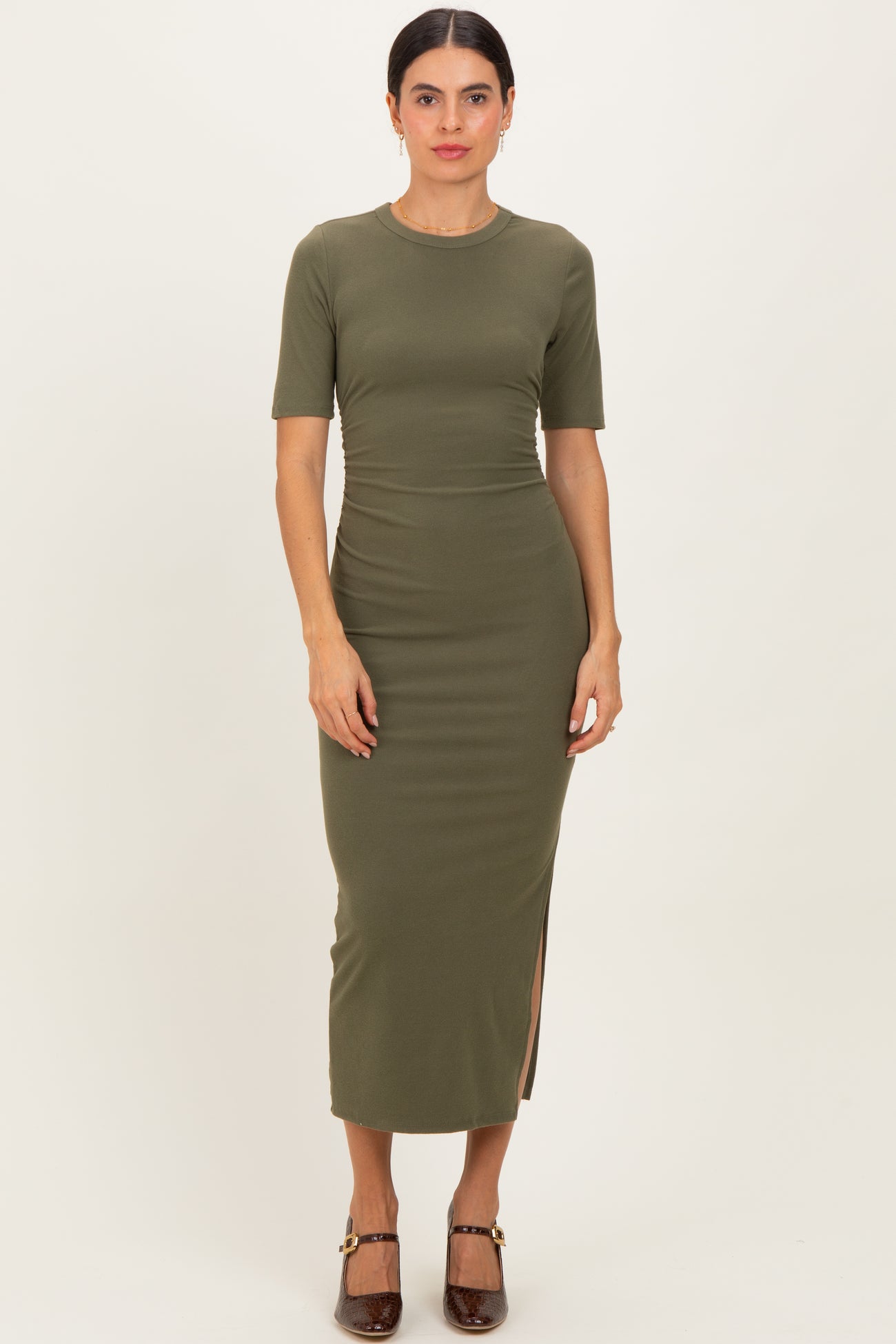 Elevate your wardrobe with our Olive Ruched Side Slit Midi Dress, perfectly blending effortless style with modern elegance. Crafted from a soft, stretch fabric, this dress hugs your curves while ensuring all-day comfort. The flattering ruched detailing along the sides adds subtle texture and shape, while the side slit brings a touch of allure and freedom of movement. Featuring a classic crew neckline and elbow-length sleeves, this versatile midi dress transitions seamlessly from day to night. Pair it with heels for a chic evening look or dress it down with sneakers for casual outings. A must-have staple for timeless sophistication.