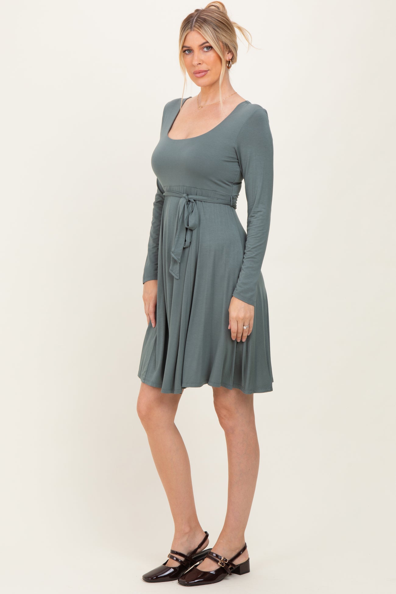 Olive Scoop Neck Long Sleeve Waist Tie Dress