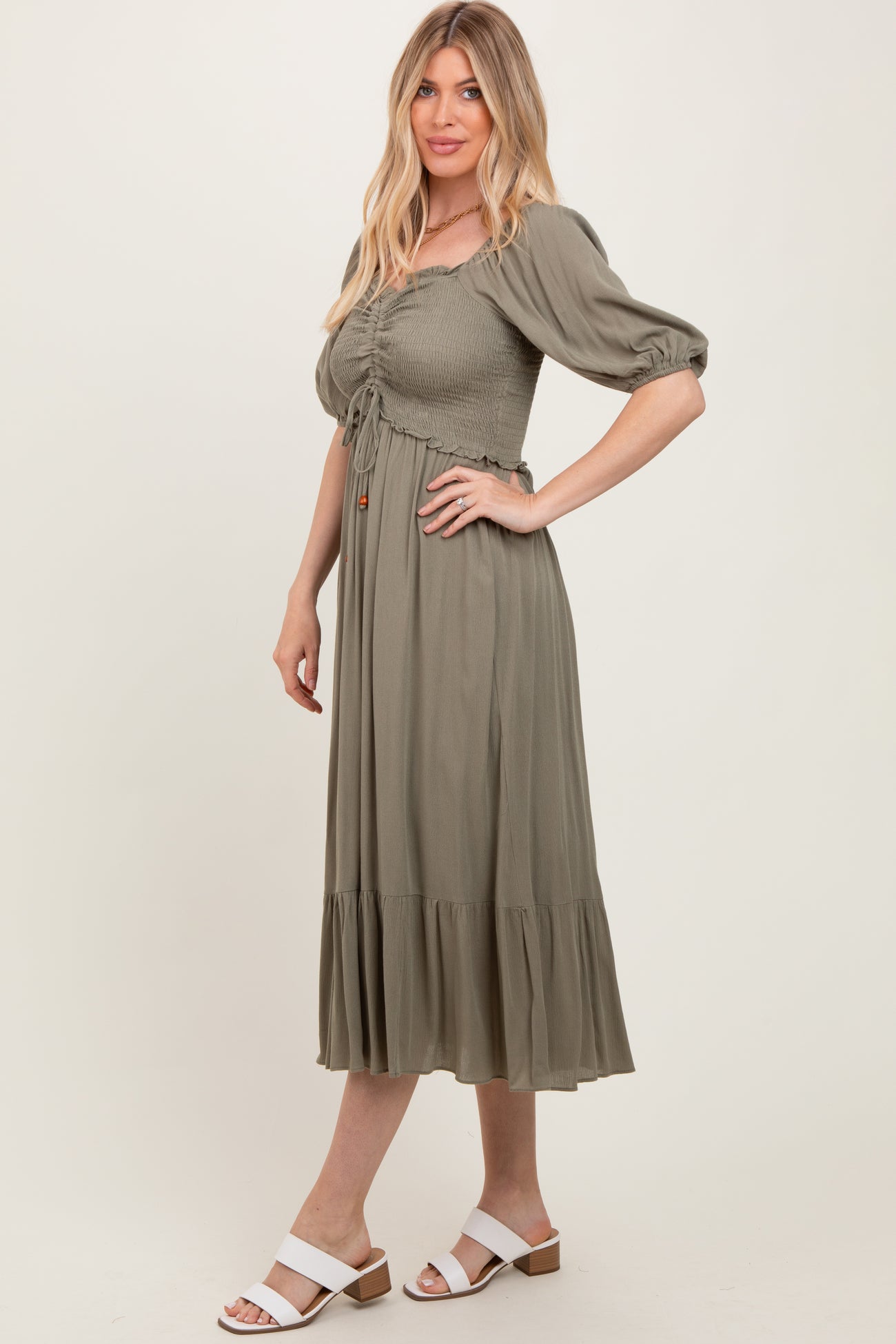 Olive Smocked Cinched Front Maxi Dress