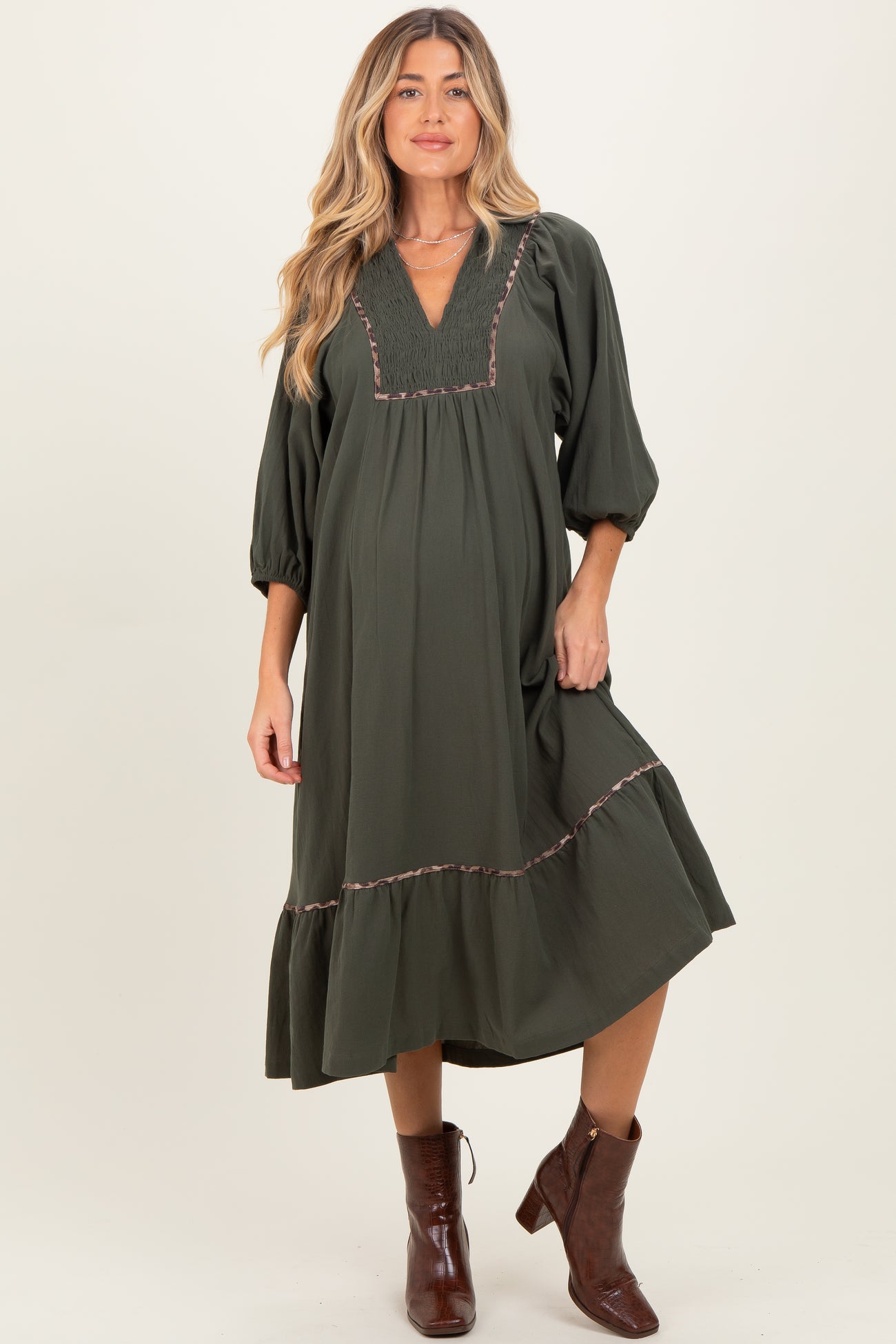 Stay effortlessly stylish and comfortable throughout your pregnancy with our Olive V-Neck Contrast Trim 3/4 Sleeve Maternity Midi Dress. Made from soft, breathable fabric, this dress features a flattering V-neckline with delicate contrast trim and gentle smocking detail that beautifully accommodates your growing bump. The 3/4 puff sleeves and tiered midi length add a chic, feminine touch, perfect for any season. Whether you're dressing up for a special occasion or enjoying casual days, this versatile maternity dress offers ease and elegance in one. Pair it with your favorite boots for a trendy look you'll love to wear all maternity long.