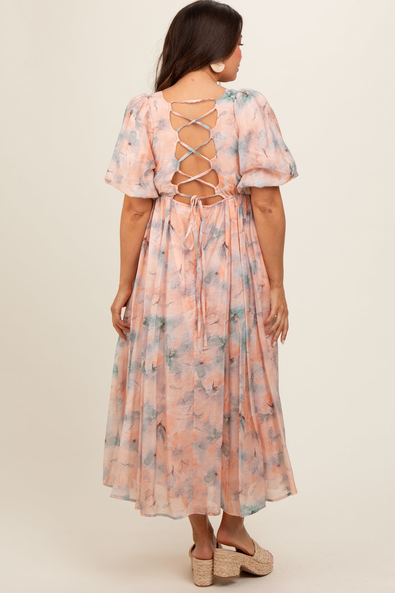 Peach Floral Square Neck Short Puff Sleeve Lace-Up Back Maternity Midi Dress