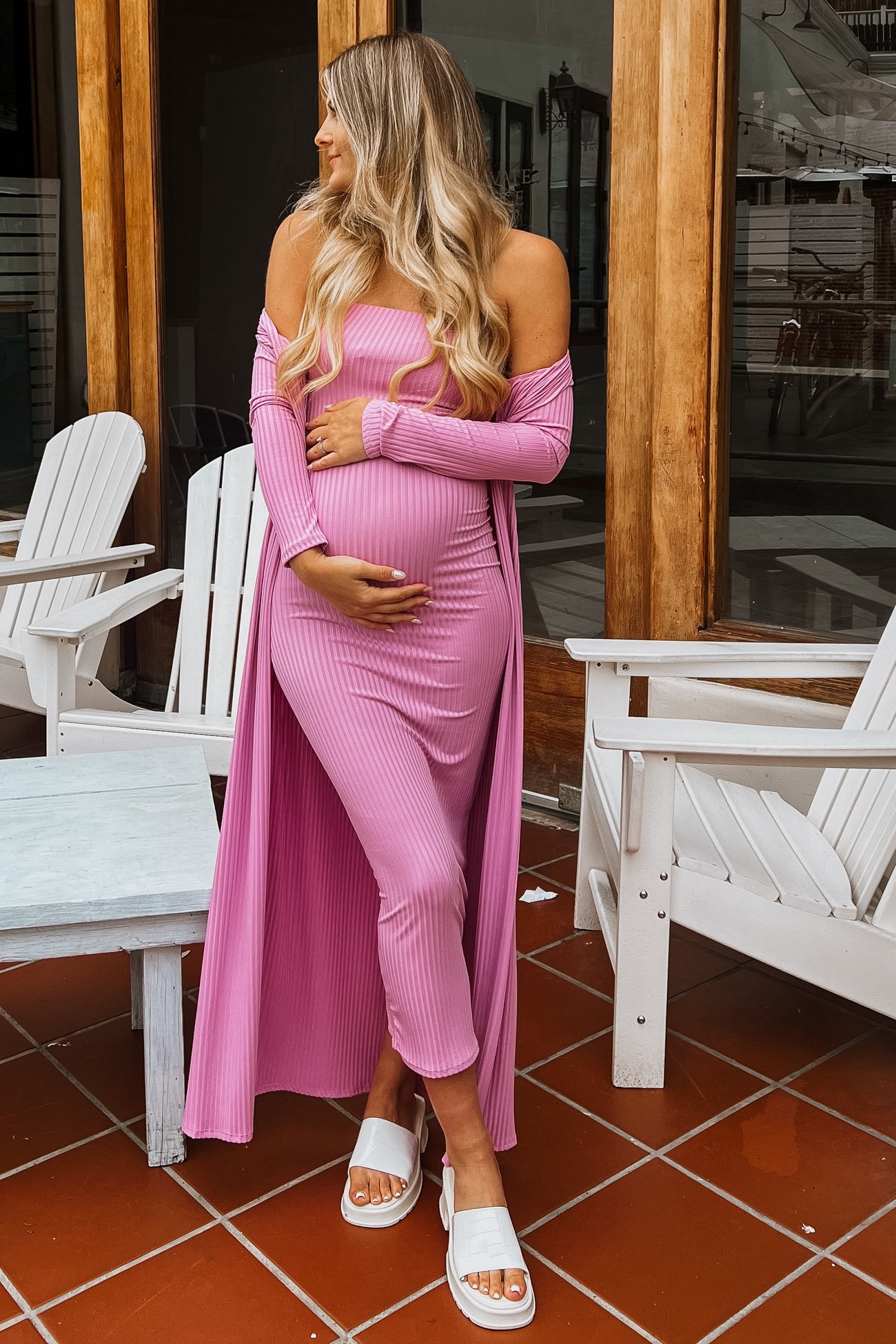 Pink Ribbed Sleeveless Dress Cardigan Maternity Set