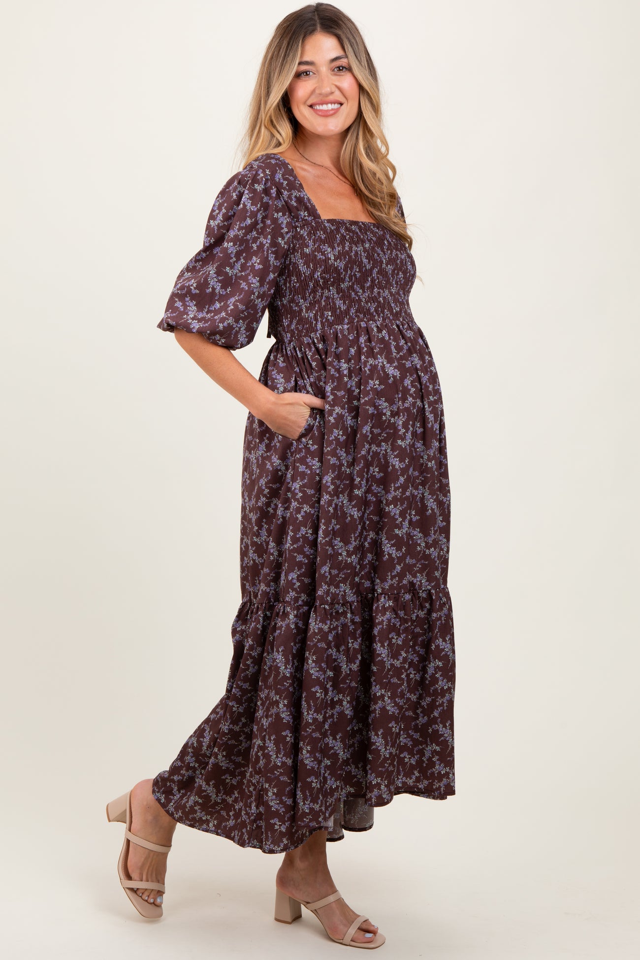 Plum Floral Smocked Hi-Low Puff Sleeve Maternity Maxi Dress