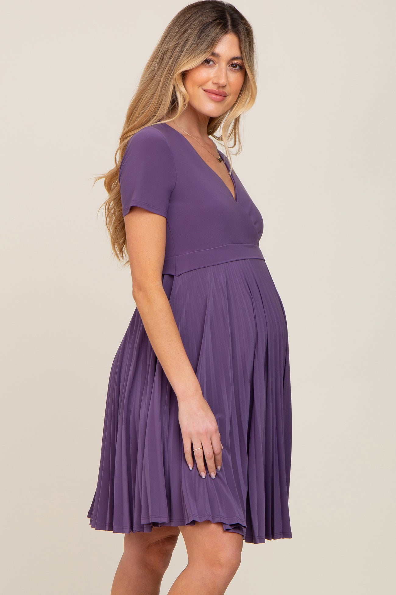 A nursing dress with a v-neckline, pleated skirt, and short sleeves.