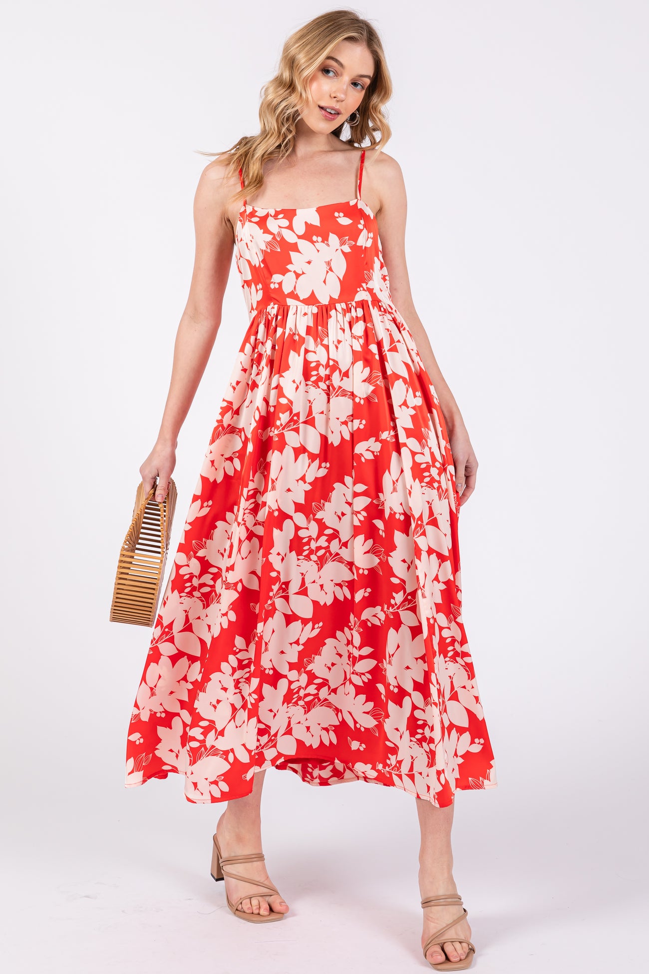 Details A satin leaf print midi dress featuring a square neckline, adjustable cami straps, a back zipper, an empire waist and double lining. Content + Care