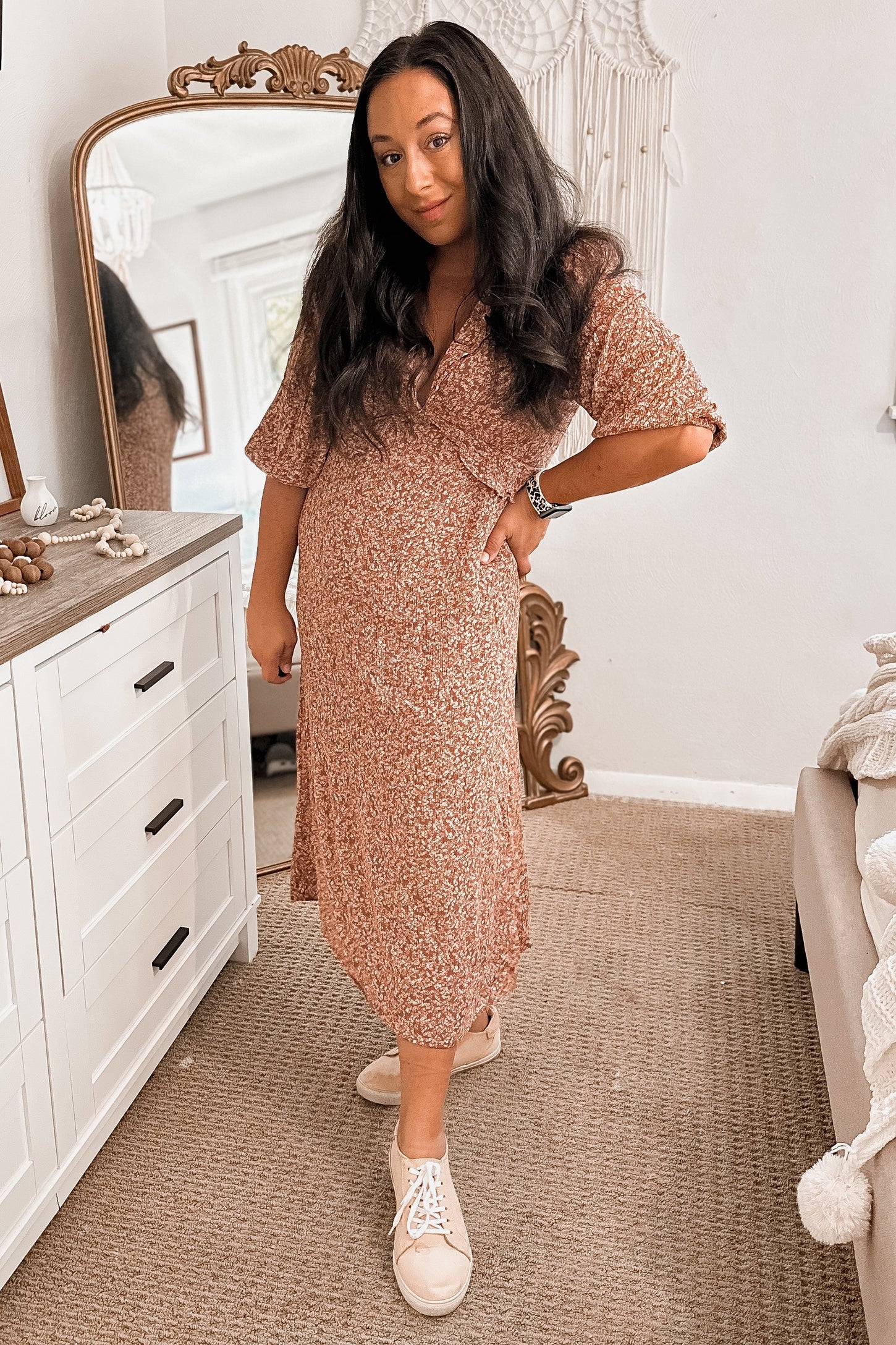 Rust Floral Ruffle V-Neck Maternity Midi Dress