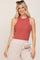 A basic solid tank top in a ribbed material with a higher neckline and rounded hem.