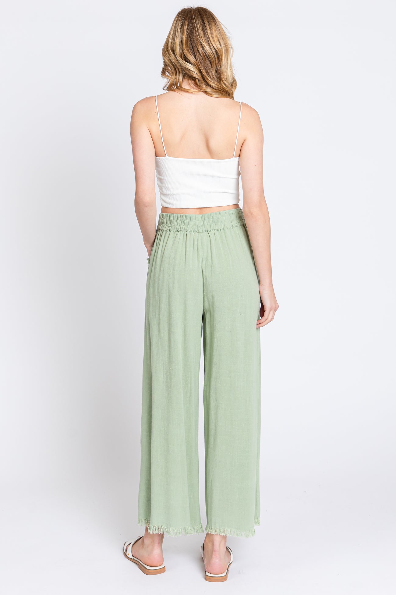 Details A pair of crop length, linen pants featuring an elastic waistband, side pockets, and fringe trim. Content + Care
