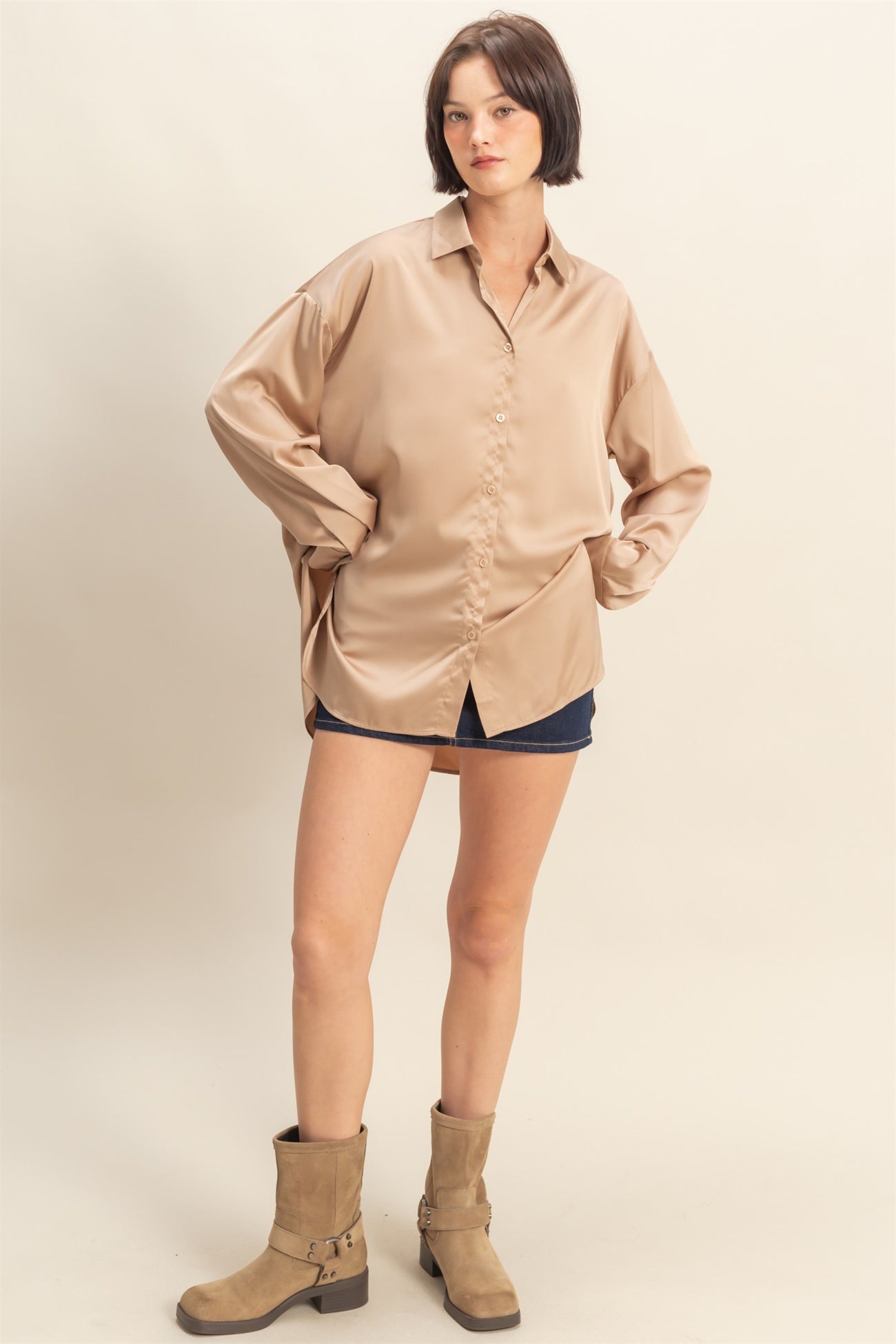 Taupe Long Sleeve Oversized Satin Maternity Shirt
