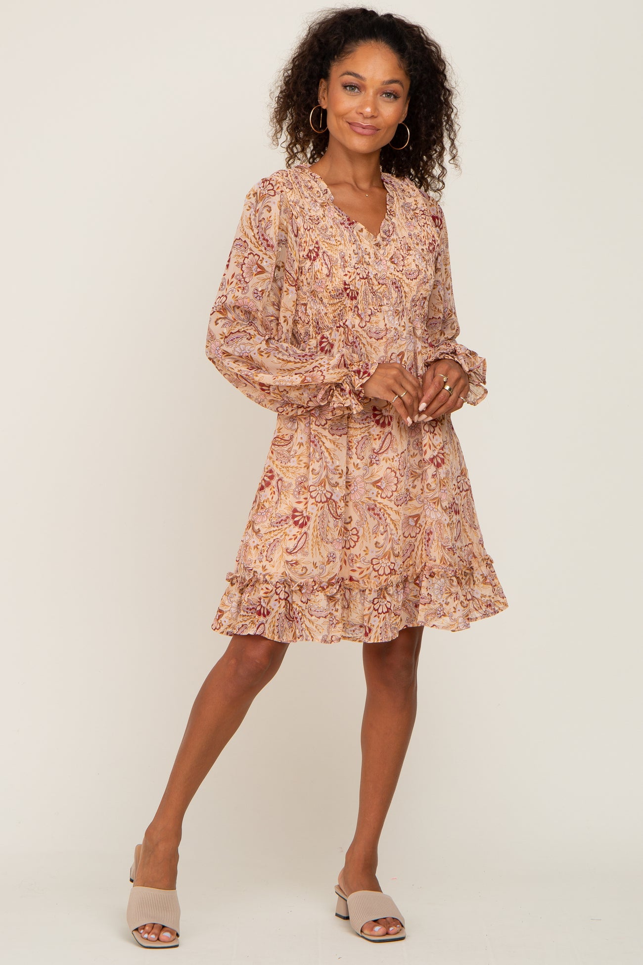Details A paisley print dress featuring a smocked top, long ruffle sleeves, a ruffle hem and a ruffle v-neckline. Double lined. Content + Care