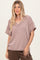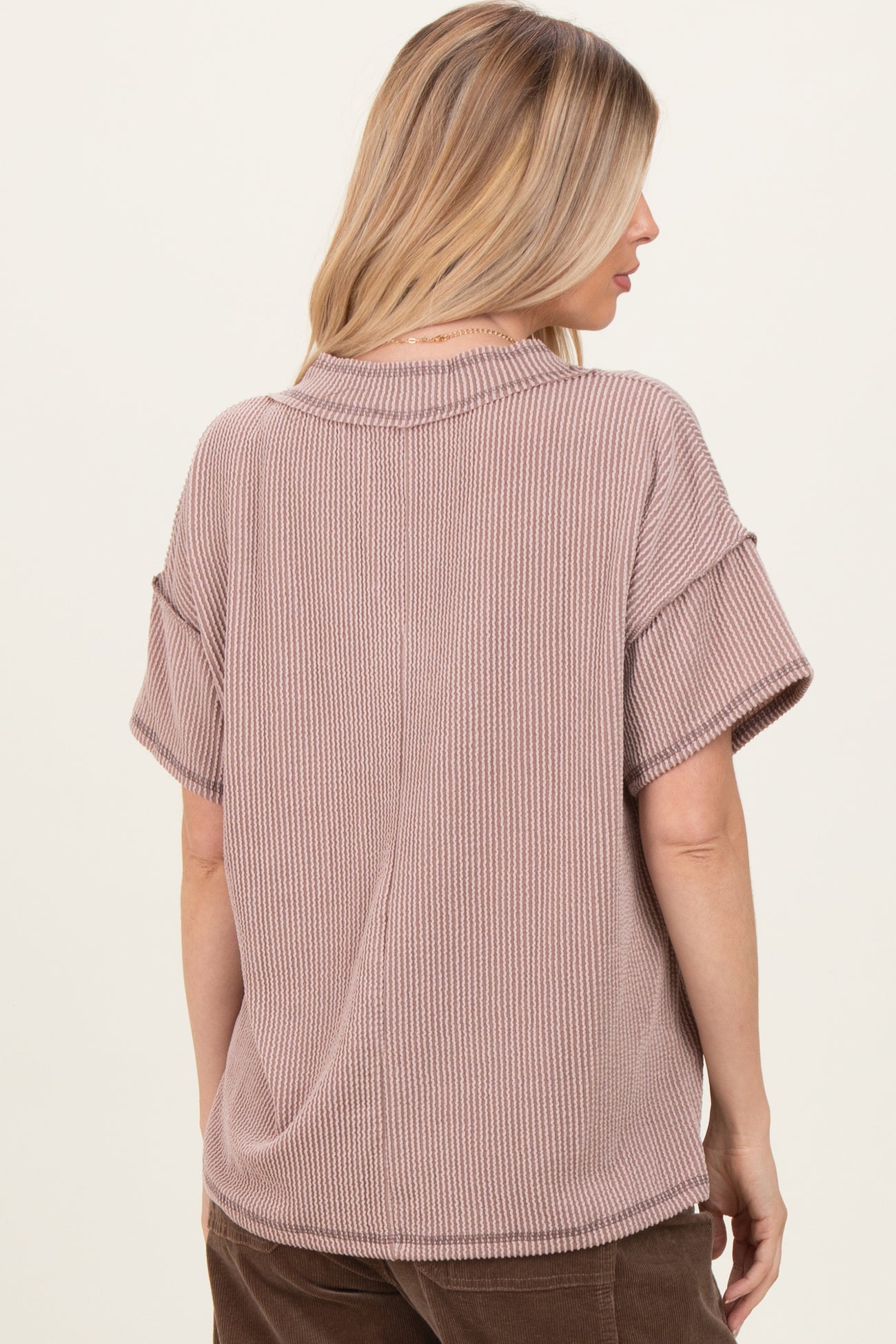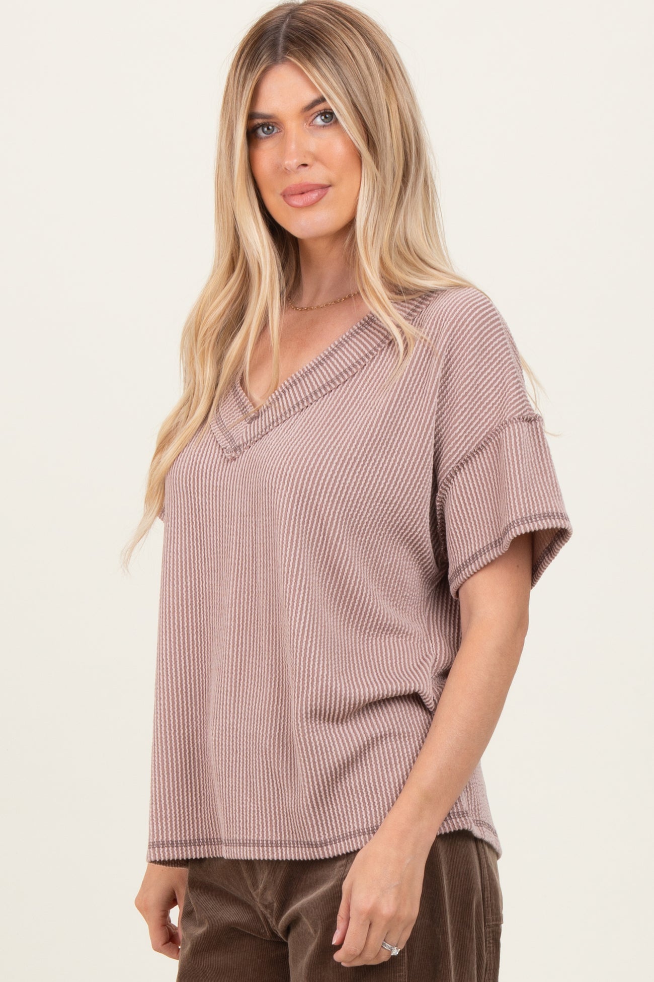 Taupe Ribbed Short Sleeve V-Neck Reverse Stitch Top