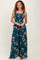 A floral print wide leg jumpsuit with a smocked bodice and side pockets with ruffle accent.