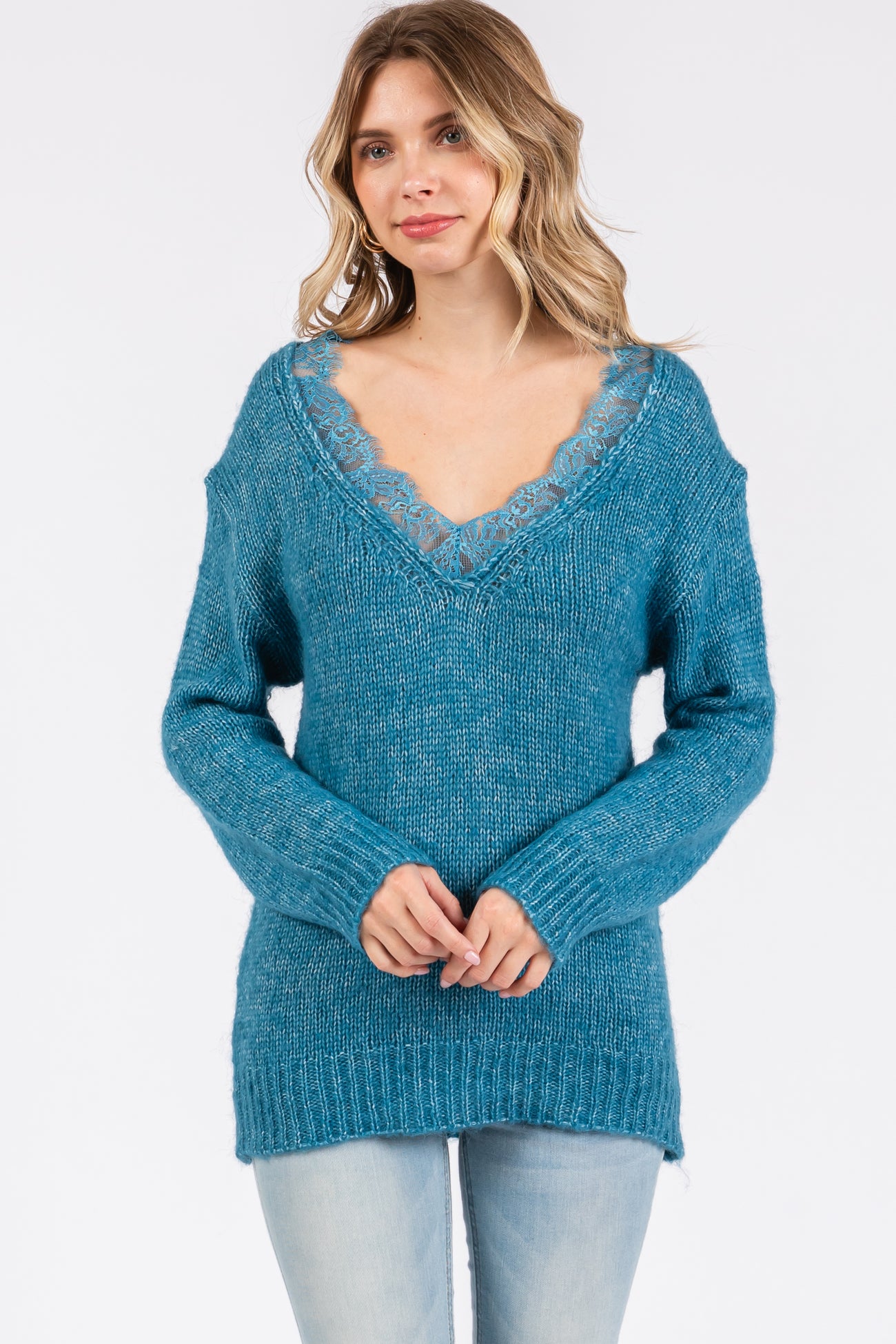 A maternity sweater featuring a v-neckline with lace trim and long sleeves.