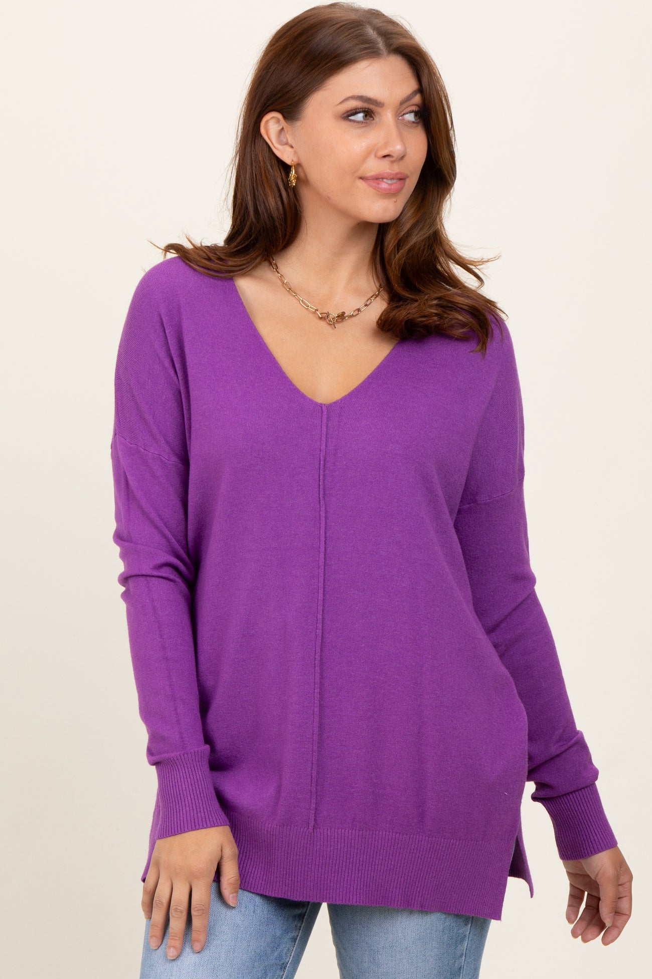 Violet Front Seam V-Neck Side Slit Maternity Sweater